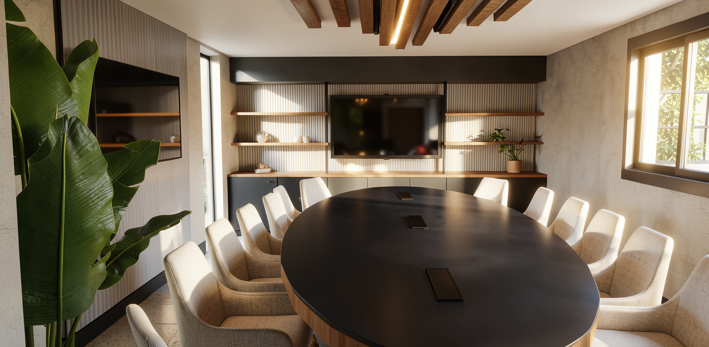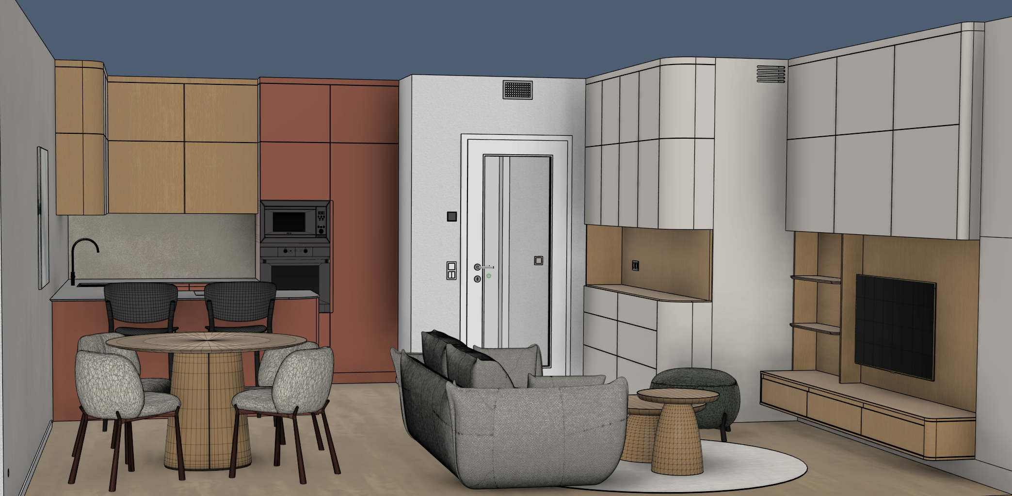 use the provided image strictly as the base image for composition camera angle furniture placement proportions and architecture do not change the layout object positions furniture shapes room geometry or architectural elements convert the scene into a photorealistic interior render important the screenshot comes from a 3d modeling view and contains mesh edges and object outlines remove all mesh lines polygon edges and modeling outlines reconstruct clean photorealistic surfaces without any visible wireframe or sketch lines very important material rules the cement plaster microcement finish is applied only to walls the cement plaster must never appear on furniture cabinets or built in joinery furniture materials must remain clearly separated from wall materials walls the wall behind the dining table and the wall continuing into the kitchen are finished with a continuous warm beige grey cement plaster microcement surface this cement plaster wall runs seamlessly from the living room wall into the kitchen behind the countertop there are no tiles and no backsplash panels only this continuous cement plaster wall finish kitchen cabinetry the lower kitchen cabinets are terracotta cinnamon brown with a matte finish the upper kitchen cabinets are natural oak wood with subtle grain important the upper kitchen cabinets must be oak wood not plaster or stone kitchen countertop the kitchen countertop is dark stone with a very subtle and almost uniform texture the stone should have minimal veining and a calm understated appearance not strong marble patterns the surface should appear elegant smooth and slightly matte right built in wall unit the tall cabinets and built in furniture on the right side of the room are painted cabinetry in a soft chalk color this cabinetry must remain smooth painted furniture not plaster or concrete wood elements natural oak wood with a soft subtle grain is used for dining table coffee tables upper kitchen cabinets wooden parts of the tv wall unit the oak should have a calm natural appearance dining chairs dining chairs are upholstered in white boucl fabric important the chair legs must be terracotta colored matching the same terracotta color as the lower kitchen cabinets door the door in the center of the scene is a glass door with a large vertical glass panel the door frame is white and the glass should appear clear and realistic with subtle reflections and transparency lighting warm natural daylight enters from the left side of the room use realistic global illumination with soft natural shadows install led strip under upper kitchen cabinets led strip under shelves in the tv wall unit lighting should be warm and subtle decoration add minimal scandinavian styling a few books and ceramic objects in shelves an open magazine on the dining table keep styling minimal and elegant rendering quality photorealistic rendering high detail materials realistic fabric textures natural wood grain soft global illumination strict constraints do not modify camera position furniture placement object proportions architectural layout existing furniture design only enhance realism lighting and materials