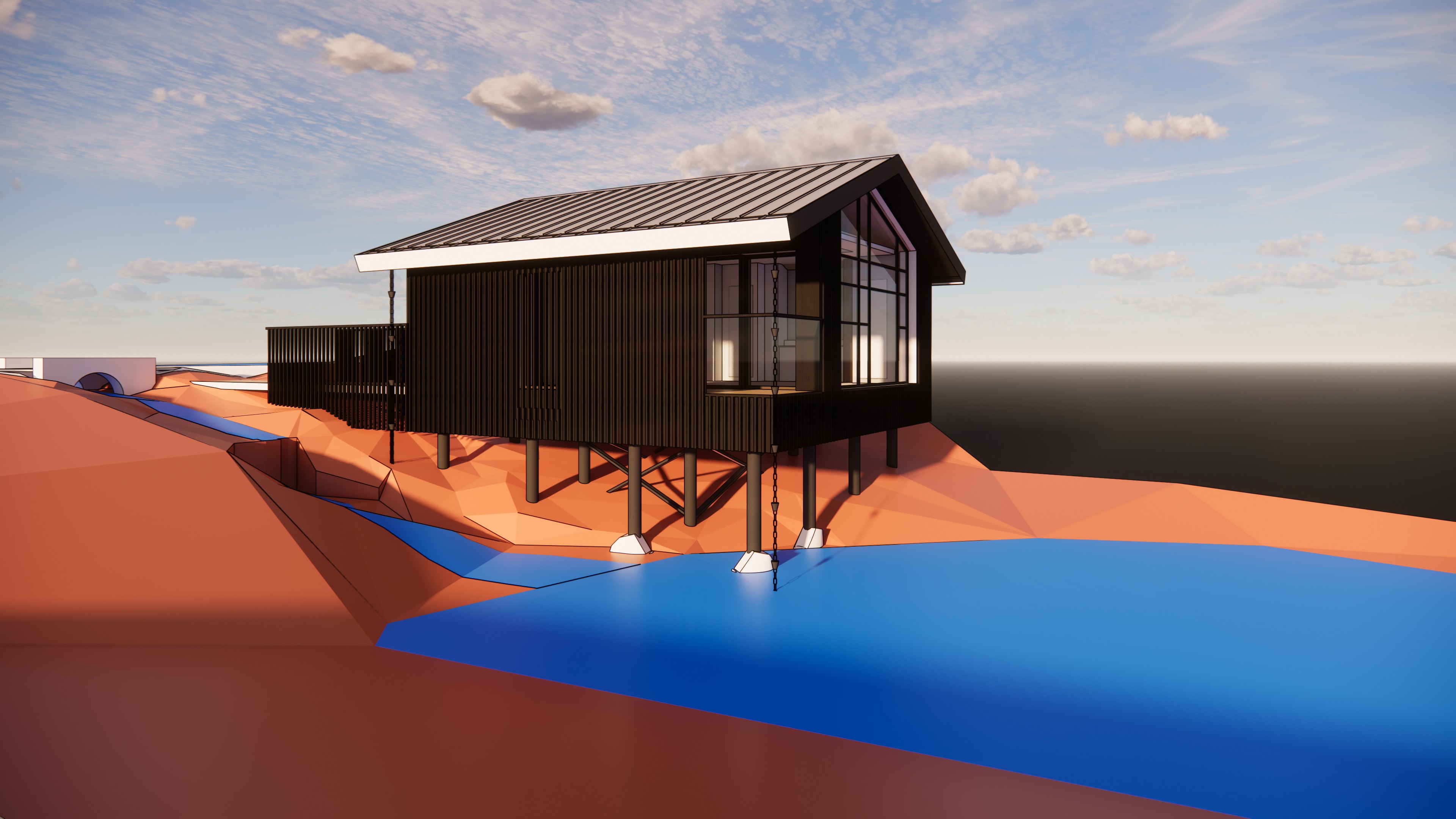 this is a house on top of small pond with small trees in the background the wall material is black burned wood please make it realistic and leave the landscape as it is the ground is dark brown with lush deciduous plants add darmera peltate plants under the house and around water leave the original structure i drawed the extent of the pond area in blue openings are in dark black