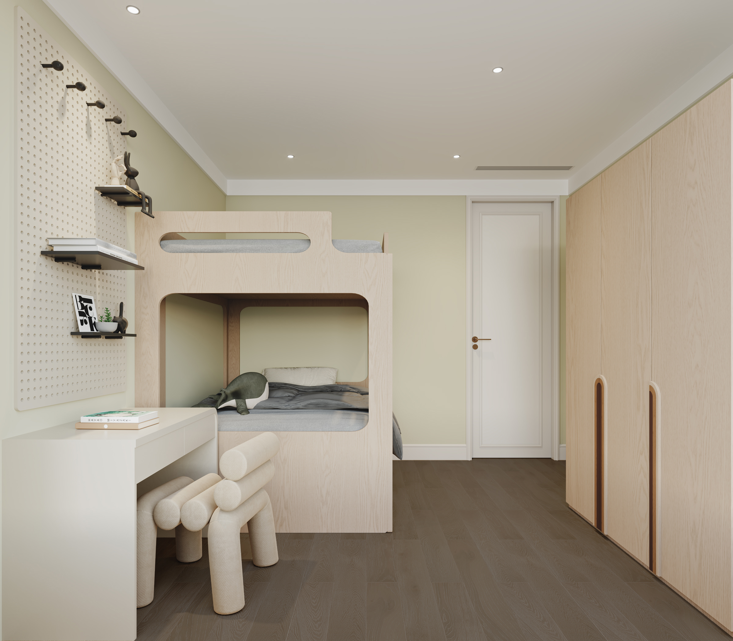 create a serene and modern bedroom with soft beige walls and elegant white paneling include a stylish abstract painting above the bed in neutral tones of cream tan and dark brown position sleek wall sconces with a warm golden light on both sides of the painting design a minimalist bed with a gray upholstered headboard dressed in luxurious beige and white linens add wooden bedside tables with a light ash finish decorated with a small stack of books and a green potted plant use dark brown hardwood flooring and a textured gray area rug with intricate geometric patterns natural sunlight filters softly through sheer white curtains the atmosphere should be tranquil and inviting with an emphasis on subtle elegance and cozy comfort