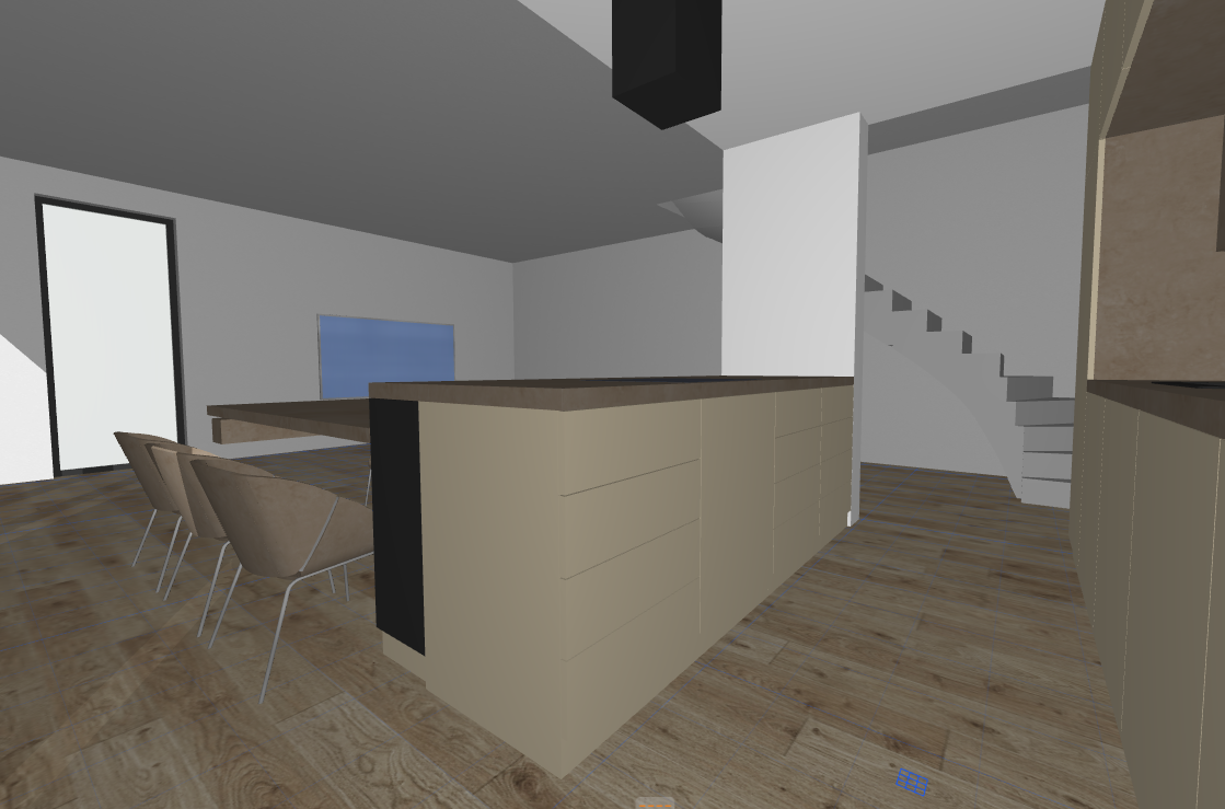 render a contemporary kitchen and living area with a minimalist design use a soft neutral color palette walls in light gray flooring in rich walnut wood kitchen cabinets in cream and backsplash in warm beige stone incorporate a sleek matte black oven and hood the countertop should be dark brown with subtle veining for texture dining chairs are taupe leather surrounding a medium walnut wooden table a plush light gray sectional sofa with a tufted pattern adds comfort illuminate the room with natural light streaming through large windows creating a serene and inviting atmosphere