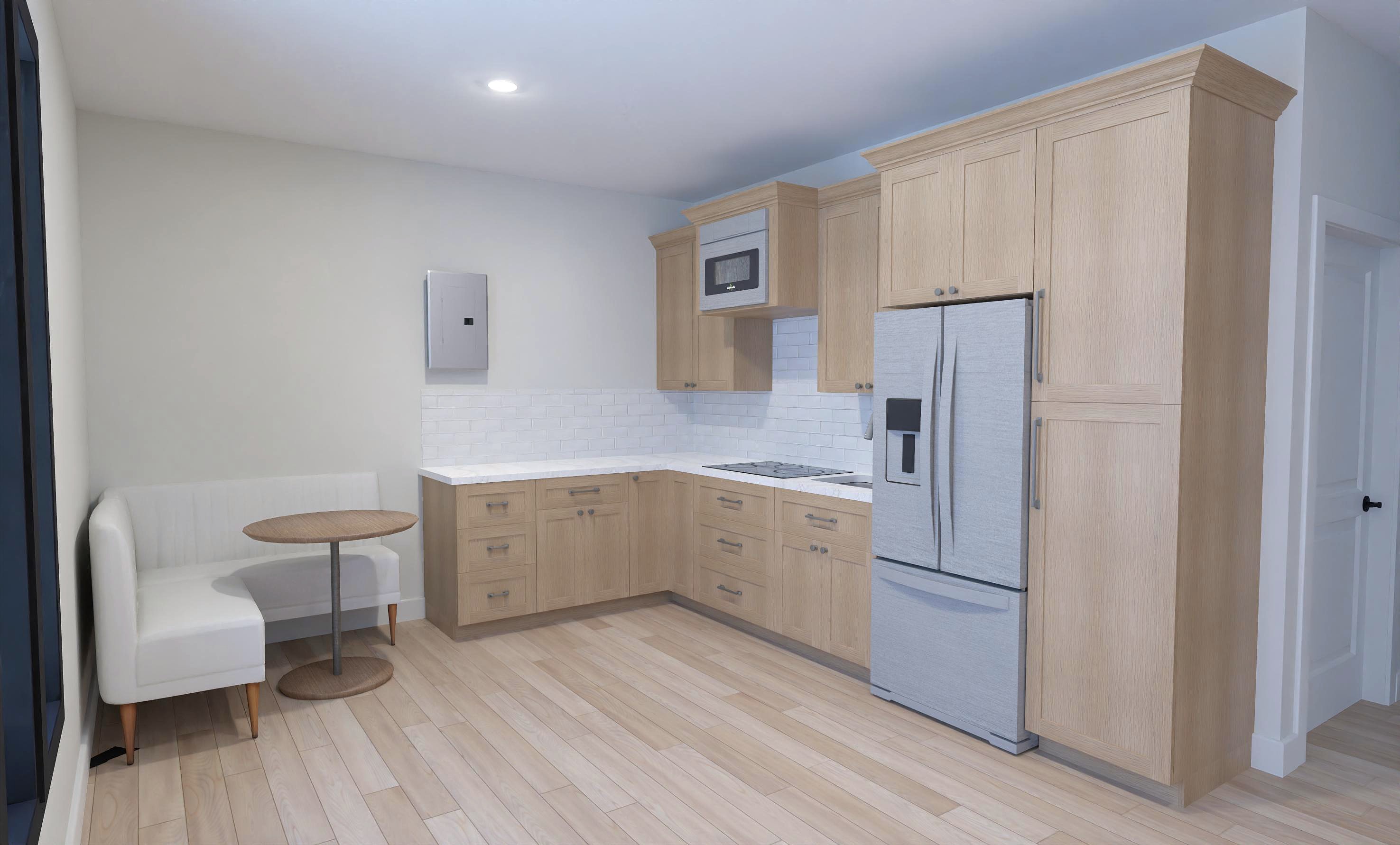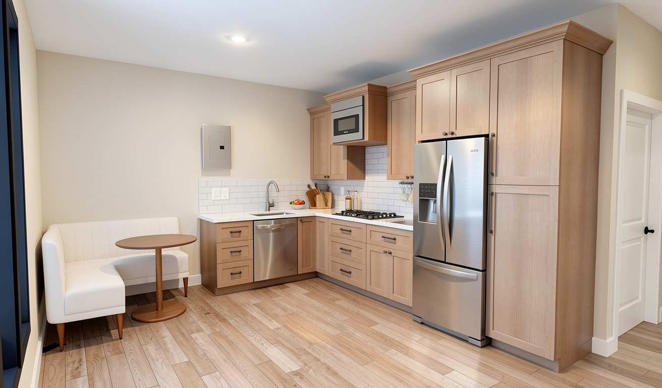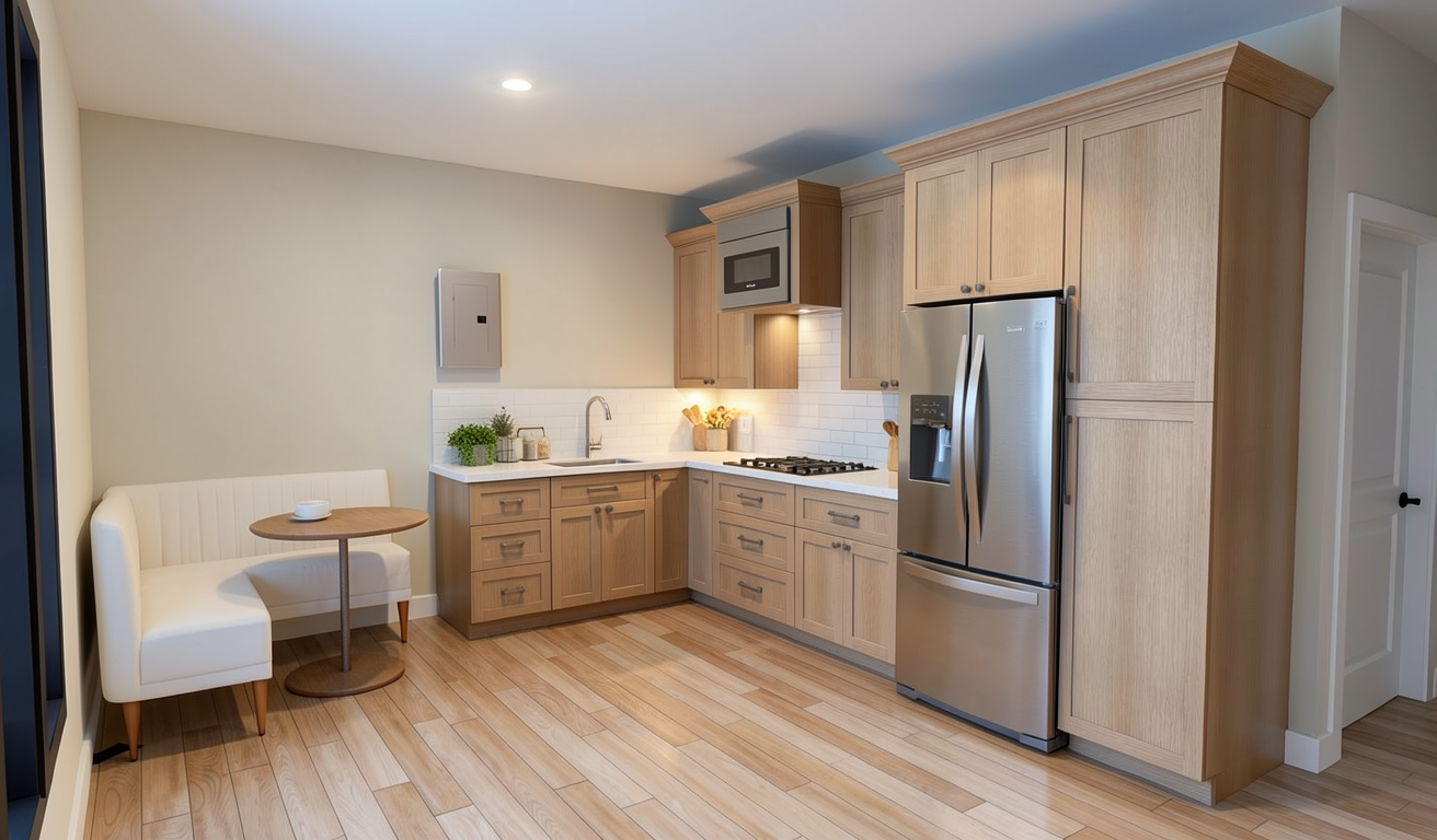 accessorize this lower level kitchenette without adding any plants or changing any colors do not add anything gray or move any fixtures