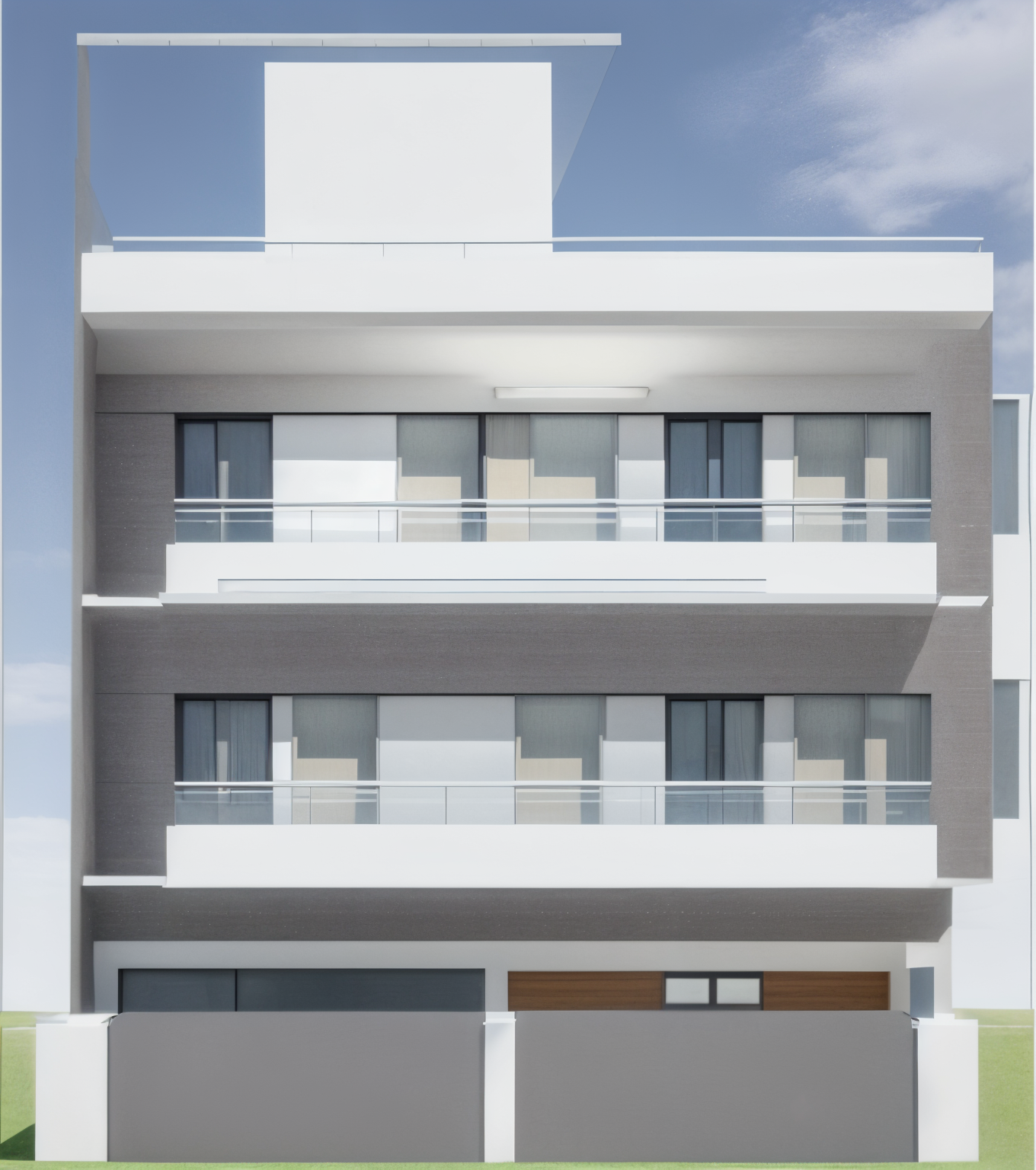 modern exterior shot don t change the image blue glass facades dark asphalt roads with directional signs beautiful green trees realism contrast details industrial area and city in the distance architecture