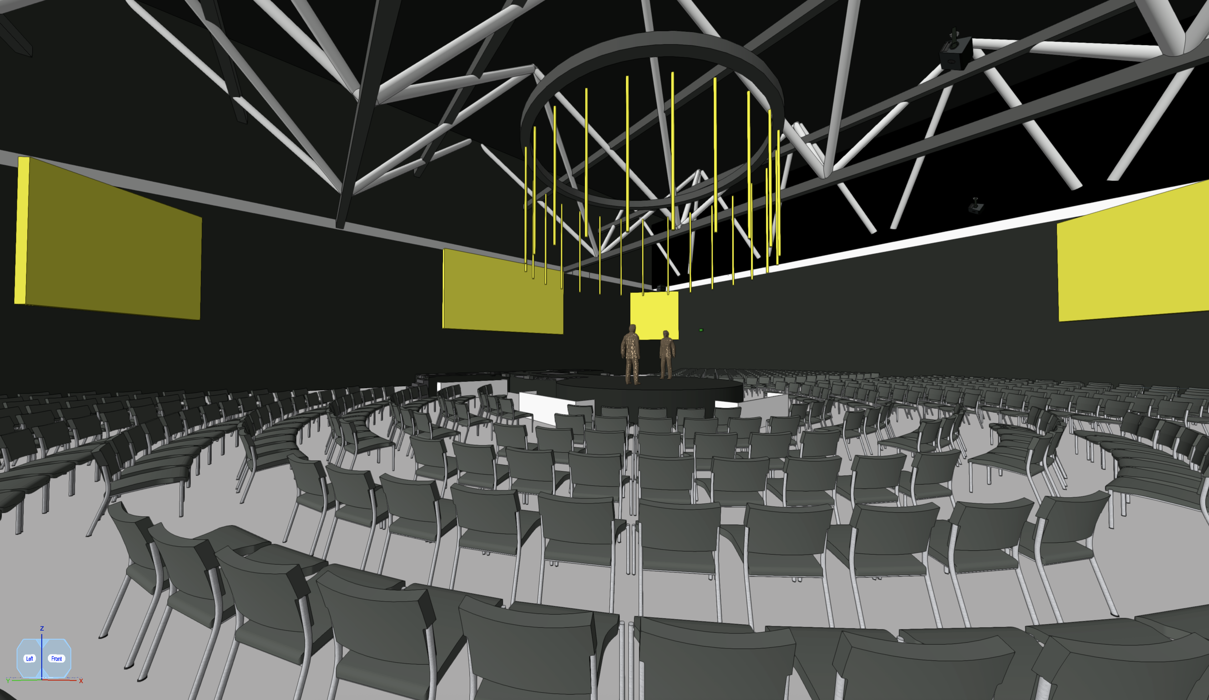 two business men stands on stage in the distance within a dark immersive stage environment with an oversized led screen and light tubes behind him illuminated glowing yellow black drapes to perimeter