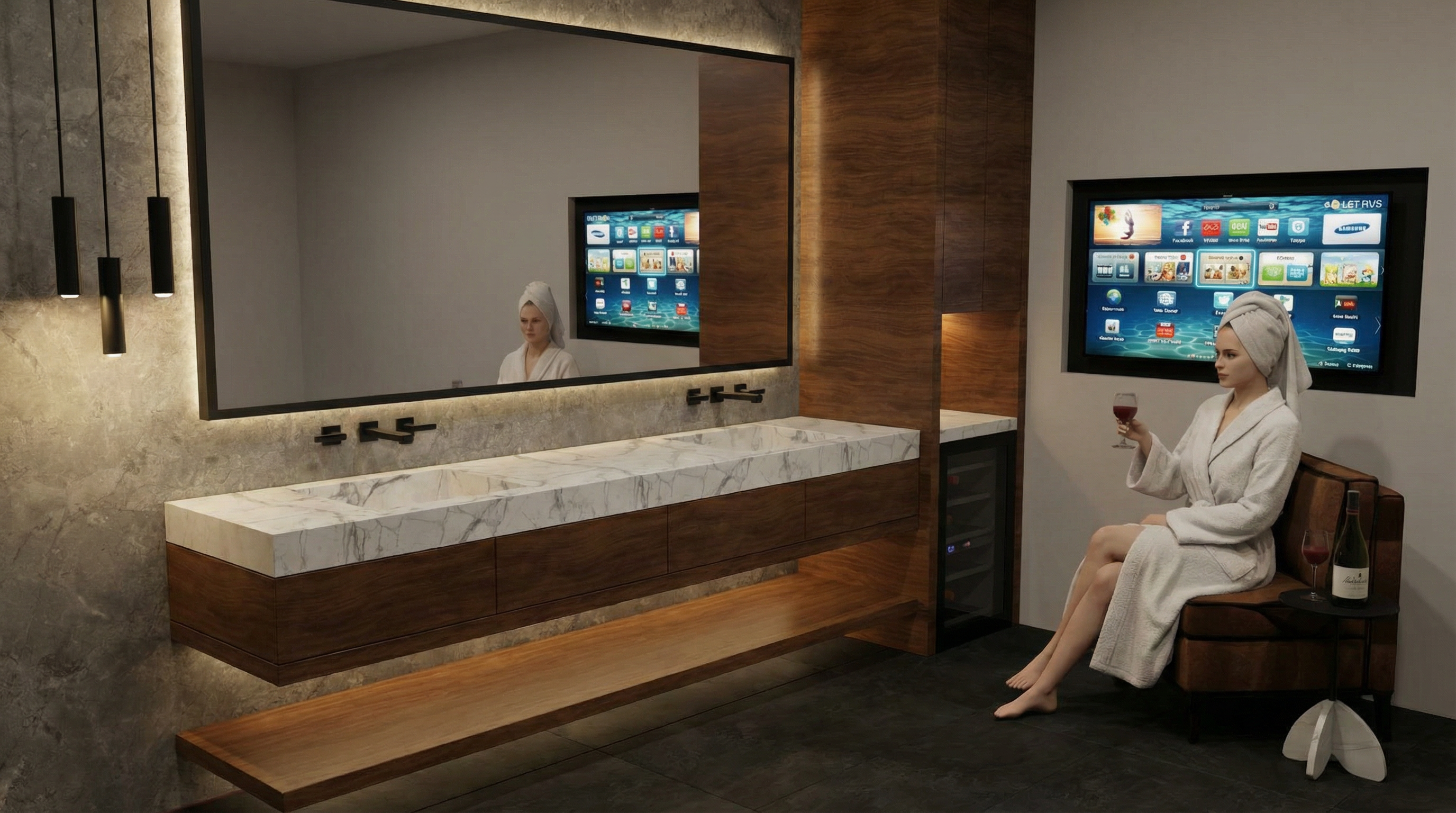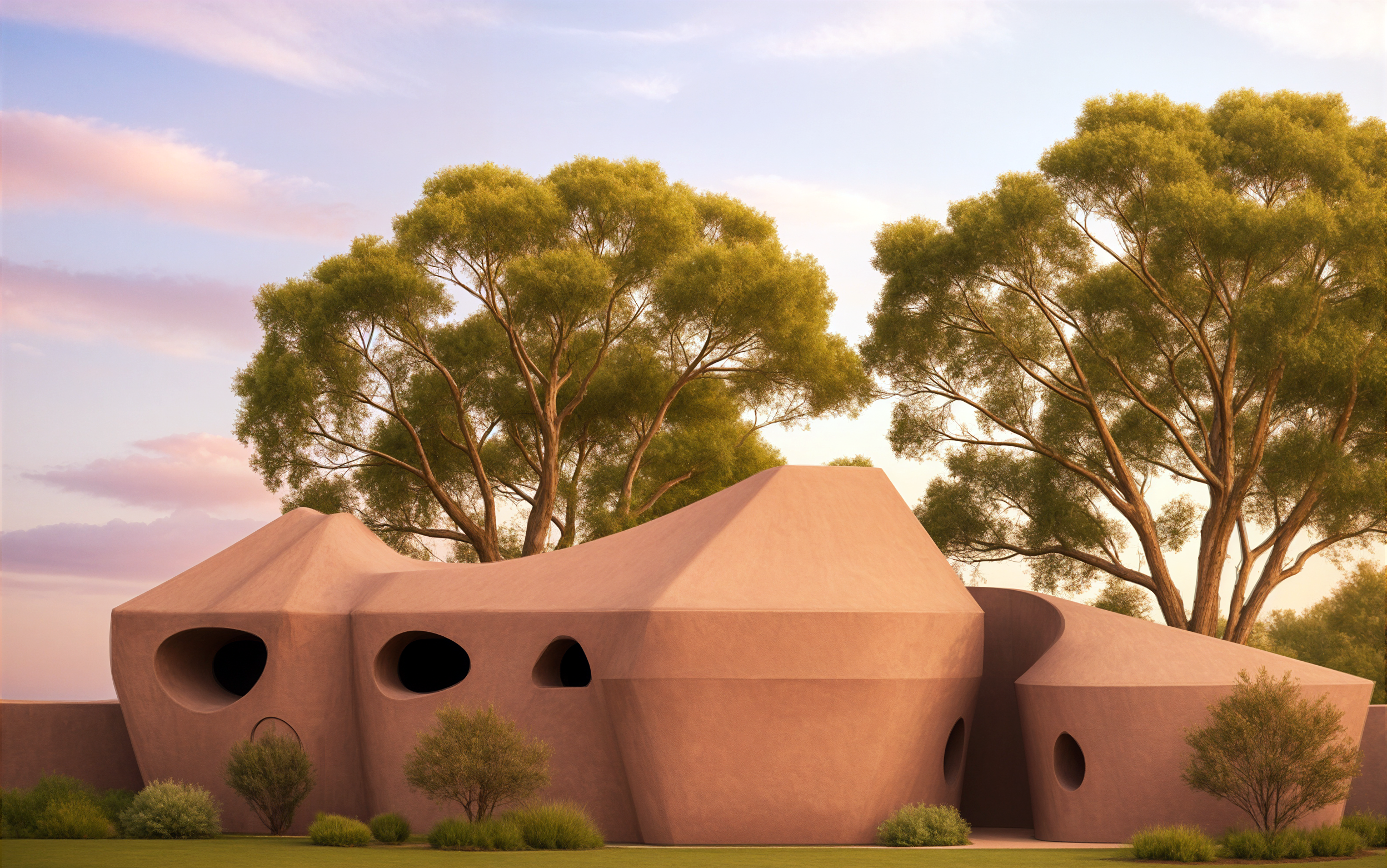 exterior shot apply soft daylight with slight haze desaturated earthy tones and a cinematic mood emphasize minimalist composition muted colors and flat entourage silhouettes that blend graphically into the scene reduce hyper real reflections and glossiness adding subtle film grain for a photographic feel final image should feel like a conceptual architectural visualization calm atmospheric and editorial make hyperrealistic