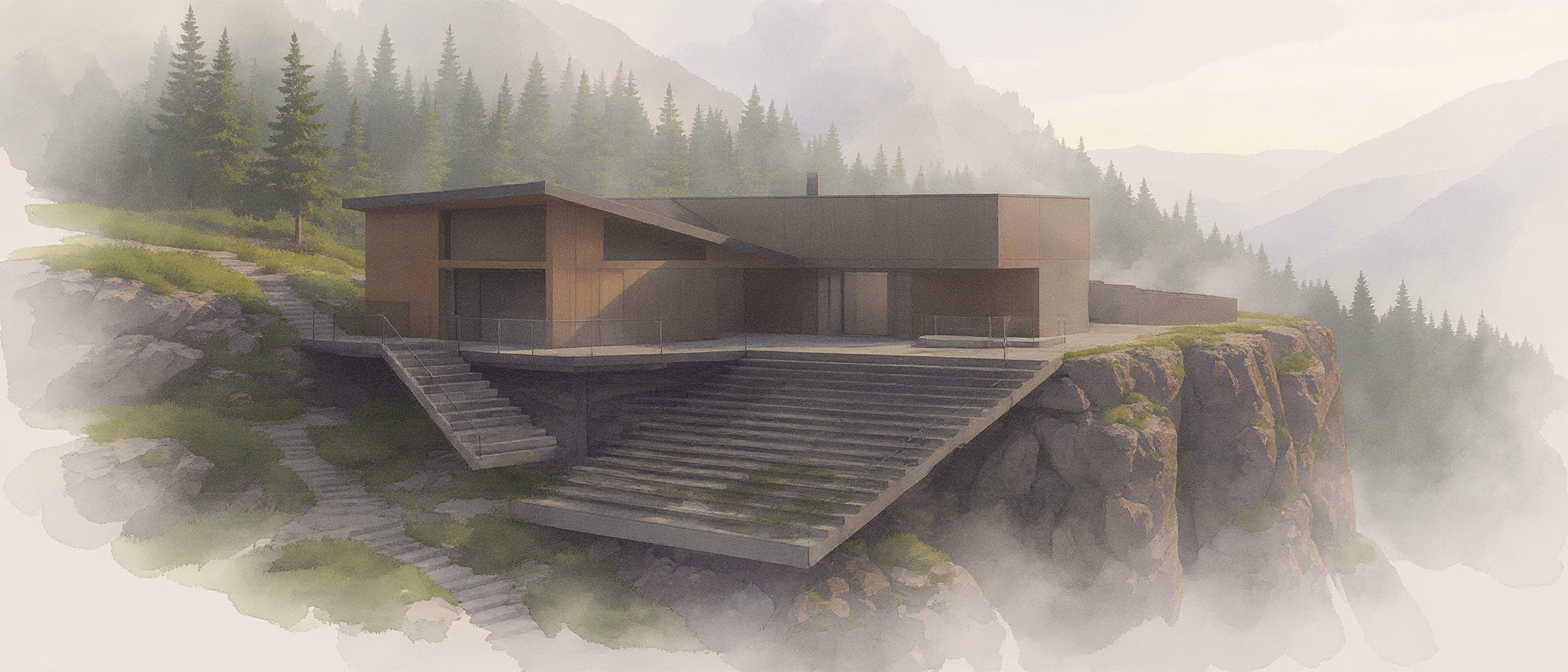 keep all geometry exactly the same render the interior as a moody modern space with smooth light wood walls and neutral gray flooring on the left side where the large window is place a cozy living room with a sofa lounge chairs and a coffee table facing the view add a white door on the same wall to the left of the large window on the right side where the smaller window is design a minimalist kitchen with a centered island cabinets along the wall with the window and a nearby dining table with chairs through both windows show tall mountain pines surrounded by gentle morning mist drifting below with soft daylight filling the interior render in a photoreal watercolor hybrid style realistic lighting pastel tones watercolor paper texture and delicate brush edges