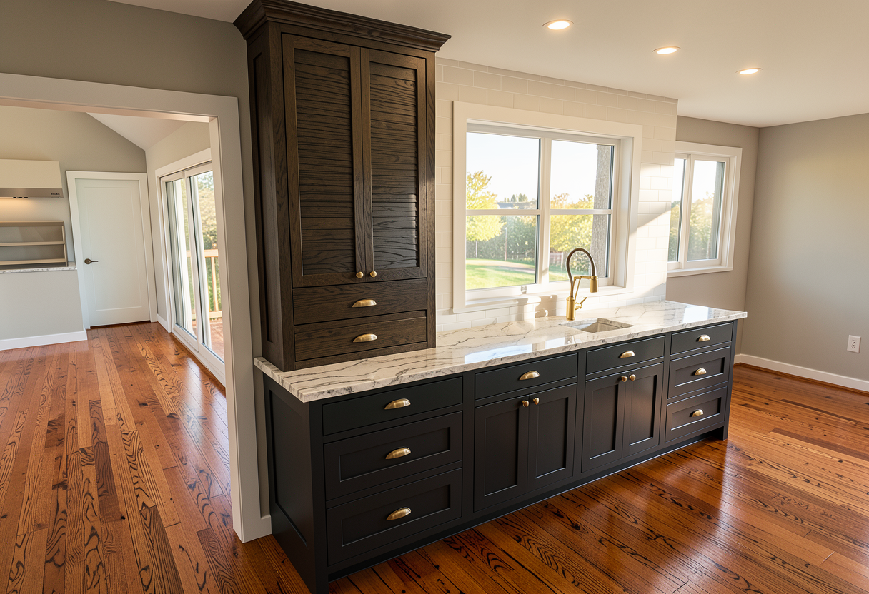 do not change the cabinets in any way preserve the exact cabinet colors materials finishes dimensions door and drawer styles hardware spacing alignment and all geometry exactly as shown do not alter the countertop shape backsplash appliances flooring lighting fixtures or wall structure only remove the construction materials clutter and mess from the scene clean the room and make it look finished and staged add a few simple tasteful home accessories appropriate for the style of the space but do not add or remove any furniture windows or architectural elements maintain the original lighting direction and realism enhance clarity and polish the photo while keeping the cabinetry and room design completely unchanged do not alter the lighting to keep the cabinet colors as they are in the image change this cabinet to be a single vanity with a vessel sink and modern bathroom make it very realistic as the image single cabinet with flush fillers against the walls