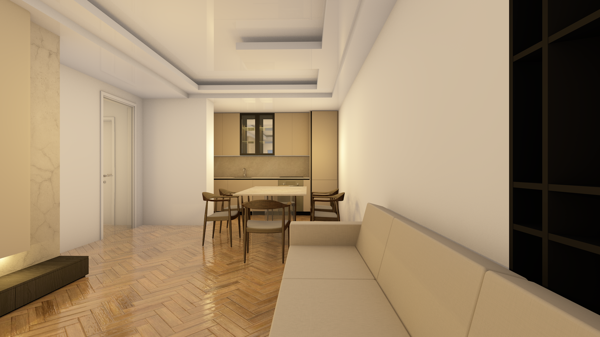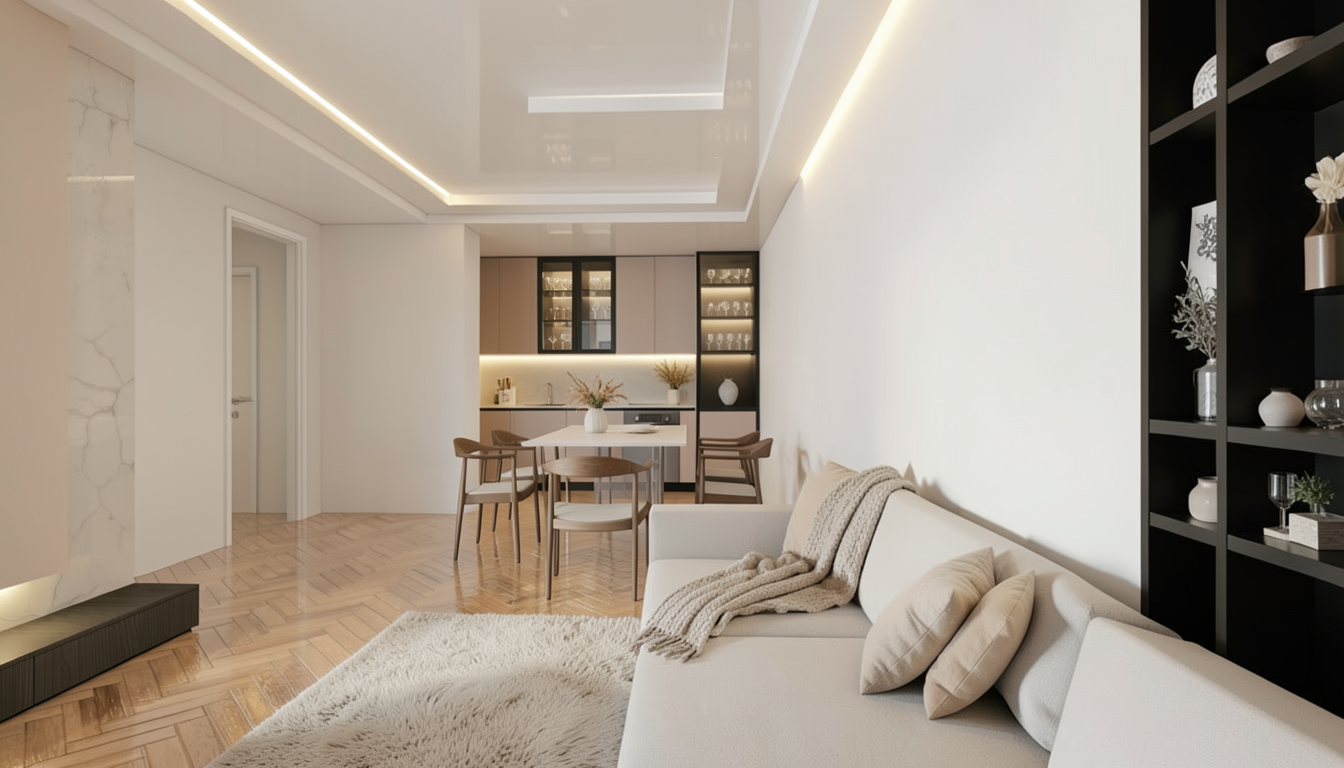 minimalist soft colors add led lights and minimal decorations add beige theme pillows and blanket on the sofa add a soft textured rug add glasses to the glass cabinets of the kitchen a beautiful decoration on the dinning table a coffee table on tha living room add decorations on the black shelves add a coffe table on tha living room keep original nodes