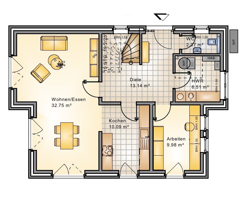 convert this floor plan into a realistic isometric 3d view of a full house show the space from an elevated angle with furniture walls and details visible photorealistic 3d floor plan render based exactly on the provided ground floor plan strict geometry rules keep layout 100 identical do not change walls doors windows do not change proportions sizes or layout all areas must match exact dimensions texts labels very important keep all room names exactly as in the plan wohnen essen kochen diele hwr arbeiten wc keep all room sizes m place labels clean and centered in each room do not rename remove or translate labels sanitary critical toilet and sink in wc must match exactly no changes no additions no repositioning style modern clean high end real estate visualization bright daylight 4k resolution photorealistic floors wc hwr k che light grey tiles 50x50 cm all other rooms light wood parquet walls pure white interior sofas beige kitchen white modern furniture wood or white dining table light wood with light chairs desks always with chair chairs light colors plants subtle in living area beds if any fully dressed with 2 pillows stairs standard stairs must always be natural wood tone no concrete or metal terrace if present must match exact size and shape from plan do not enlarge surface small brick paving ziegeloptik access large floor to ceiling glass doors furniture always include outdoor table light chairs or lounge at least one planter driveway parking if present exact layout from plan reddish brick paving include at least one car garage if present always include one car inside garden grass lawn hedges around property hwr utility room include realistic elements washing machine dryer storage shelves technical units e g heating system clean and organized look roof if visible anthracite roof tiles only lighting natural daylight soft shadows bright and friendly negative rules no layout changes no scaling errors no missing labels no renamed rooms no invented sanitary elements no wrong materials no oversized terrace use the same furniture as shows on the plan do not change the orientation of the floorplan