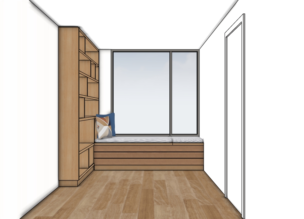 please keep the image details as per the original image can you please add some decor to the bookcase can you please change the door to be white with glass insert please make the window frame dark grey