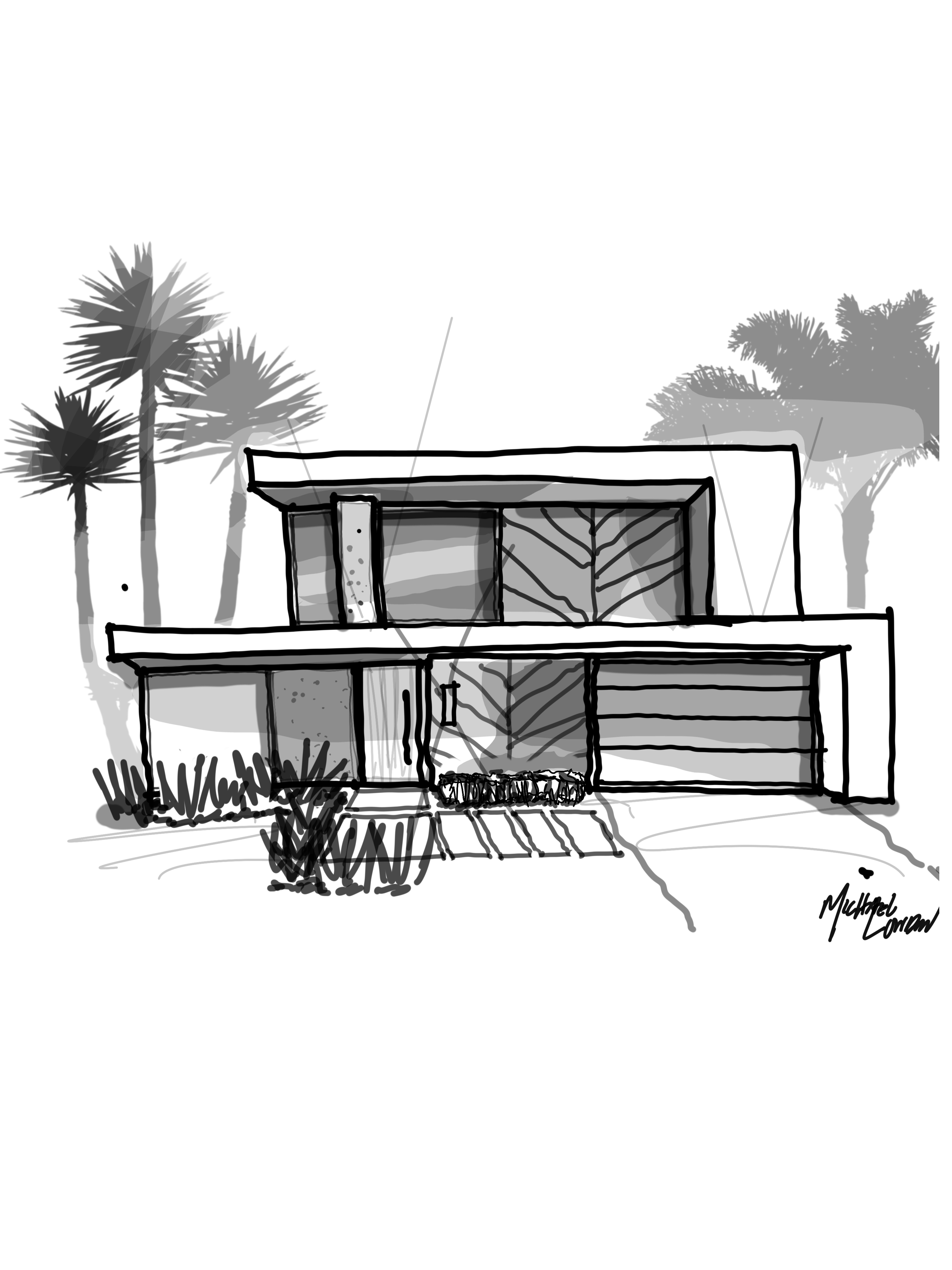 modernist exterior shot modern two story house with a sleek minimalist design featuring large glass windows and smooth concrete walls the building is set against a backdrop of tall lush palm trees with deep green leaves the sky is clear and bright with a soft blue hue the foreground is accented with well manicured grass in a vibrant green and small ornamental shrubs the atmosphere is serene and inviting with a warm golden sunlight casting soft shadows the overall color scheme is neutral with accents of white gray and natural earth tones the garage door is a modern brushed steel architecture