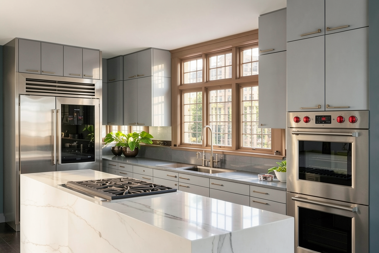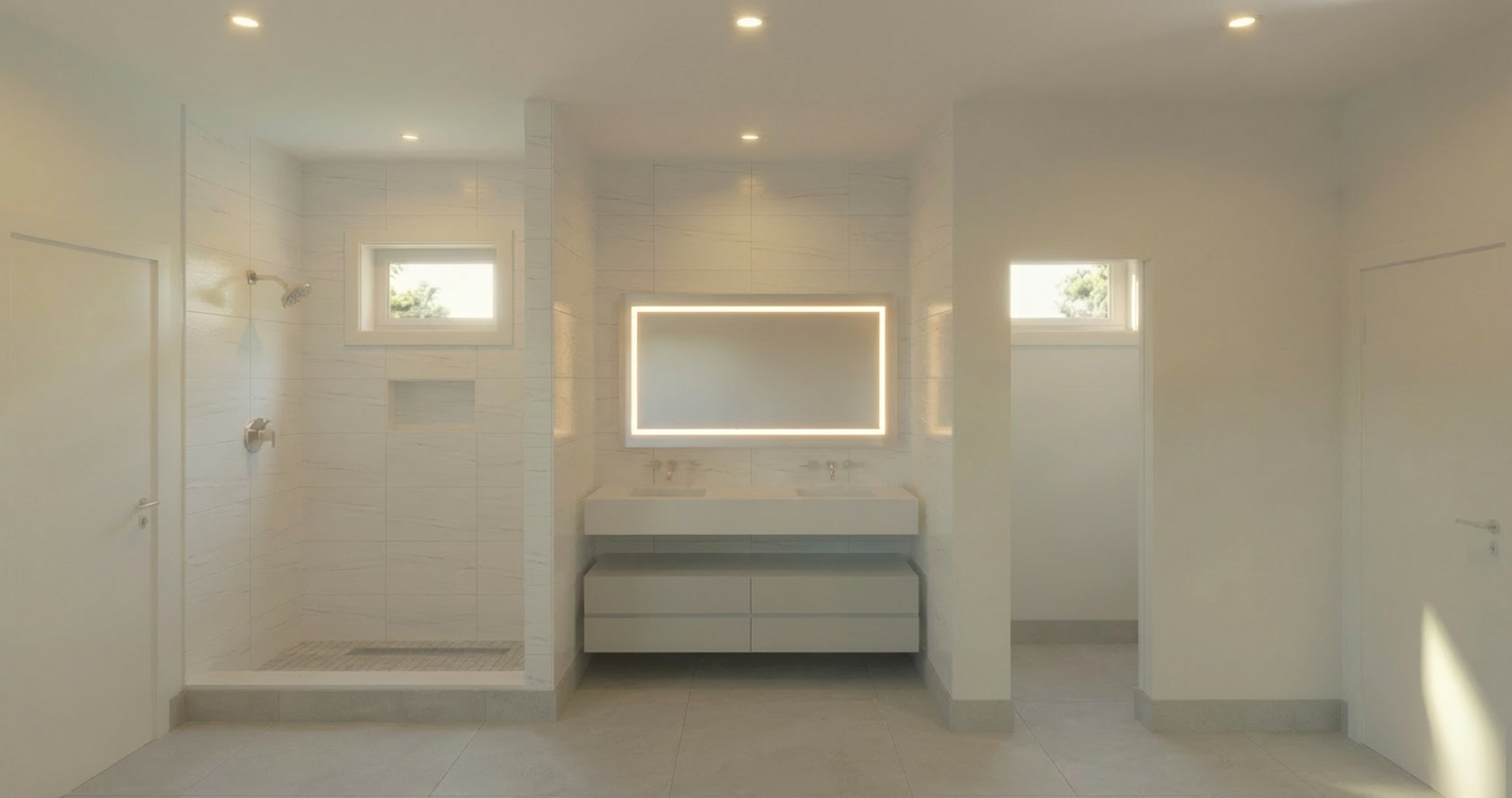 keep everything exactly the same in the rendering do not change the layout walls doors vanity fixtures shower tile windows ceiling or floor only make the shower niche as long as the window above it do not change anything else in the room