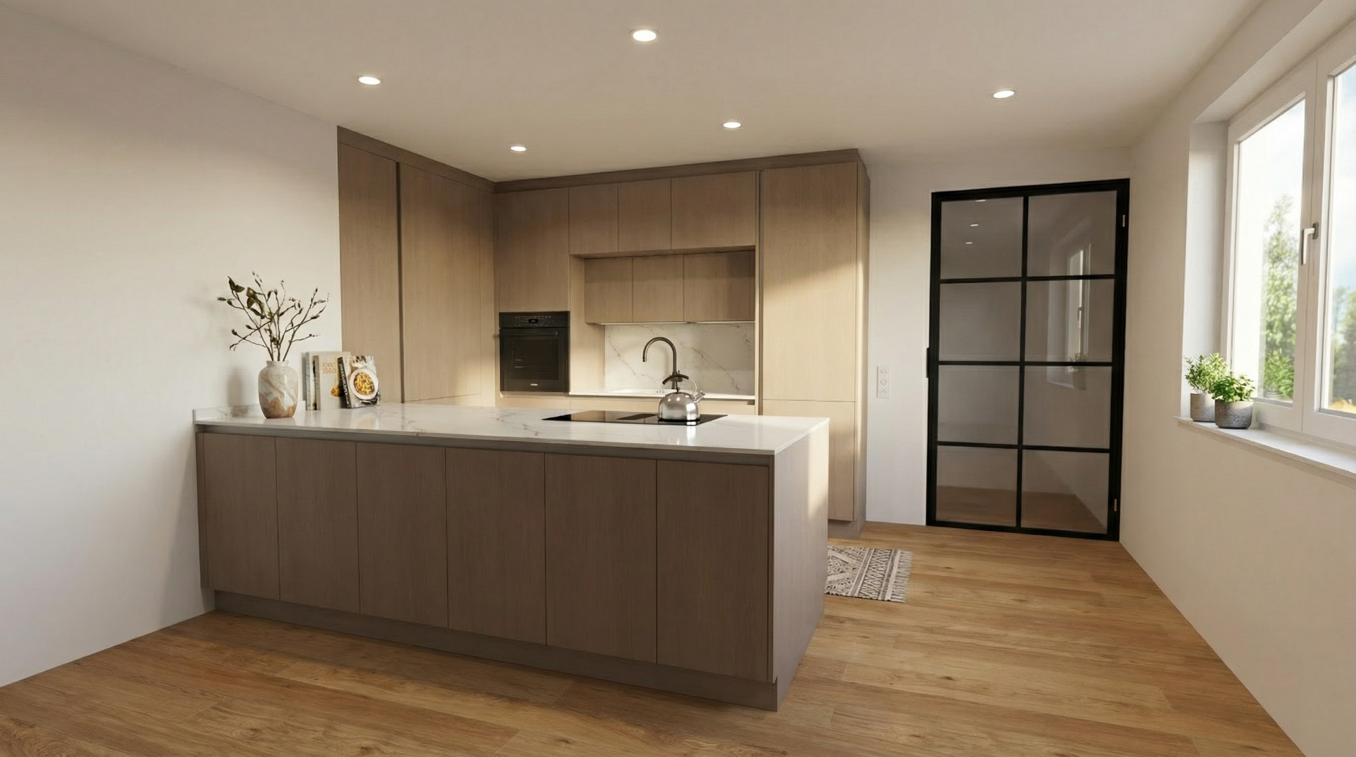 exterior shot organic modern interior design warm natural color palette sand clay terracotta warm beige soft taupe flowing organic shapes and curved furniture sculptural forms natural materials linen wool raw wood travertine clay plaster walls soft diffused daylight calm cozy atmosphere minimalist styling layered textures low seating rounded sofa and coffee table subtle accent colors only on pillows and one armchair muted sage green dusty rust soft ochre earthy tones biophilic design indoor plants seamless architecture high end editorial interior photography soft shadows realistic materials ultra detailed warm cinematic lighting contemporary organic aesthetic clutter free composition