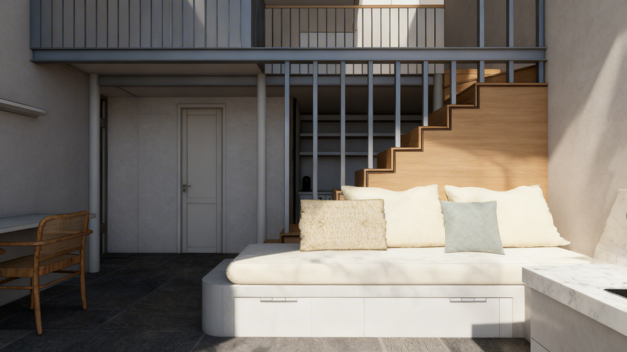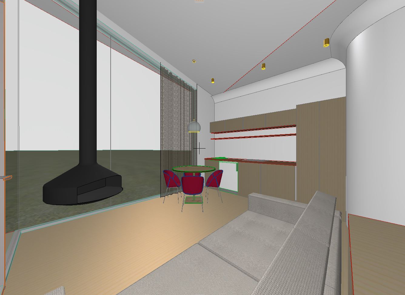 interior design for a a luxury modular house retreat with organic and wavy shaped walls on the left corner there is a suspended fireplace with fire inside the fireplace has a black metallic finish with semi matte finish the floor is made from hardwood floor natural tone with cracks and wear areas to look more realistically in the close up there is a couch that has natural earthy tones there is a natural linen carpet under the couch area on the right there is a kitchen in back the kitchen has natural wood finish cabinets with led light that have warm light and soft shadows between the suspended and the fire place there is a round dining table with 4 chairs the table and chairs are made from natural materials all the interior walls are cladded with a bumpy textured surface that look like santorini white walls there are multiple interior lights that set a calm and relaxing tone and also decorative objects to make the place look more relaxing and realistic the suspended lights above the dining table has a wicker lamp shade on the ceiling there are multiple spotlights that cast warm lights and their shadows touch the walls and give a dramatic effect the sunlight comes in from the large left window and has warm light and soft shadows outside the window you can see greenery outside with a hill side backgroundand blue sky and a few white clouds the ceiling has the same texture as the walls there is no wall to the right of the room the fireplace is light up format picture 16 9 extradetailed and ultrarealistic interior all elements have sharp details
