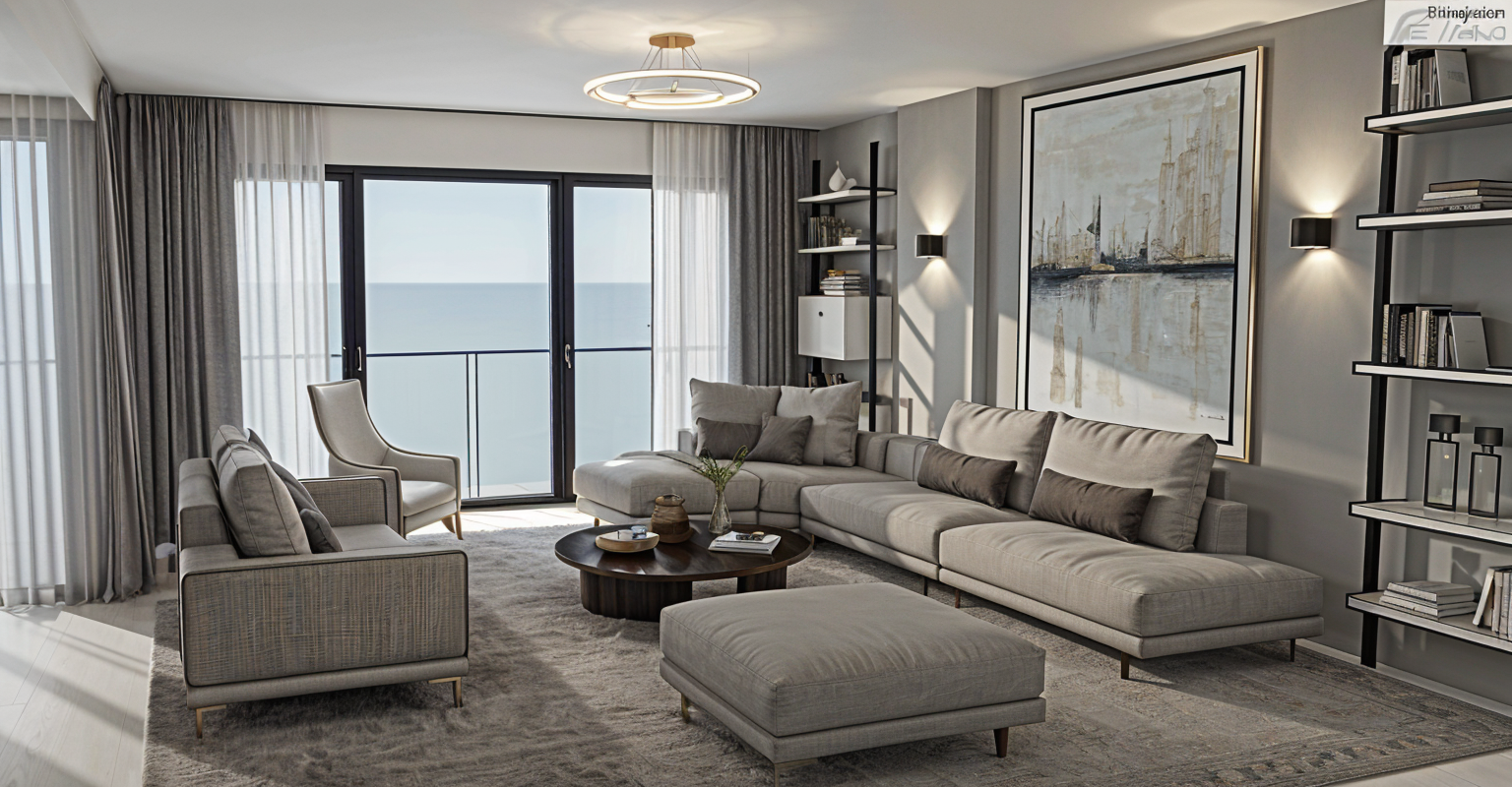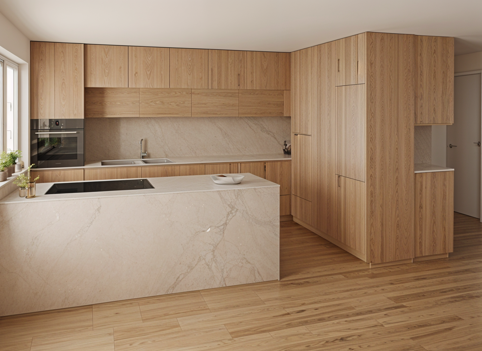 floor oak ceiling in beige bright cabinets panels in oak nature matte countertop in beige sandstone stone