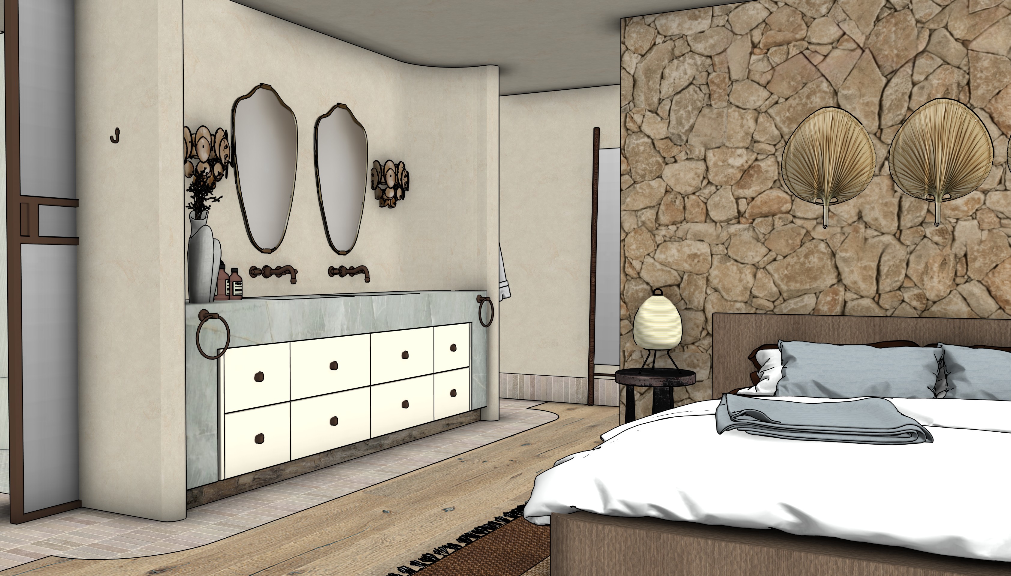 the wall sconces are soft brown toned murano glass the glass door has a bronze frame and cathedral glass insert the vanity cabinetry is white polyurethane which a reclaimed timber kickboard