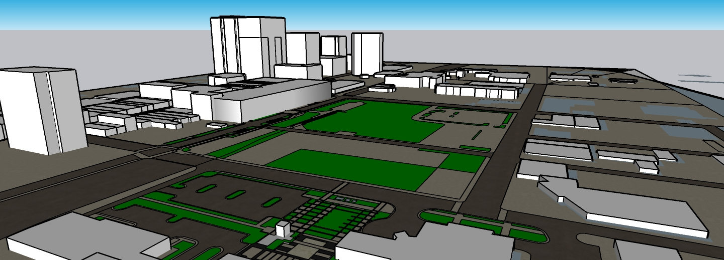 a soft minimalistic isometric architectural massing style buildings are shown as simple white or off white blocks with very smooth edges and no textures lighting is bright and diffused creating soft ambient shadows and gentle falloff rather than sharp contrast vegetation appears as simplified uniformly colored green masses with very light shading no detailed leaves or textures roads are flat gray surfaces with subtle gradient shading the overall color palette is extremely light and clean with soft pastel greens and grays the scene has a slightly hazy atmospheric bloom effect that gives it a calm bright almost dreamlike feel no outlines no harsh edges no labels and no realistic materials just pure conceptual massing with soft light