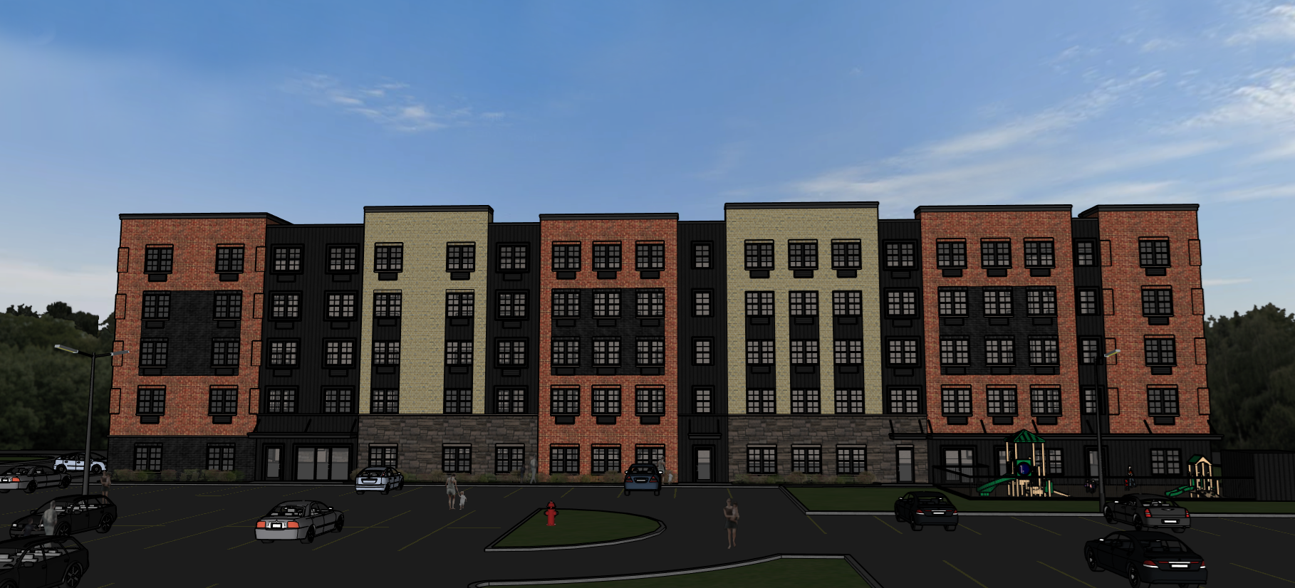 render a photorealistic 3d perspective of this apartment building in bracebridge ontario reference the current material styles and colours just enhance the brick and stone veneer black steel siding black red and brown brick concrete sidewalks keep model geometry the same for windows doors and walls in town setting enhance the current materials detailed textures in the siding and glass reflections vibrant clear sky with light atmospheric depth render in hyper realistic architectural visualization quality 8k resolution enhance playground with kids playing new asphalt parking lot with parking islands with just grass and vegetation is low and well kept