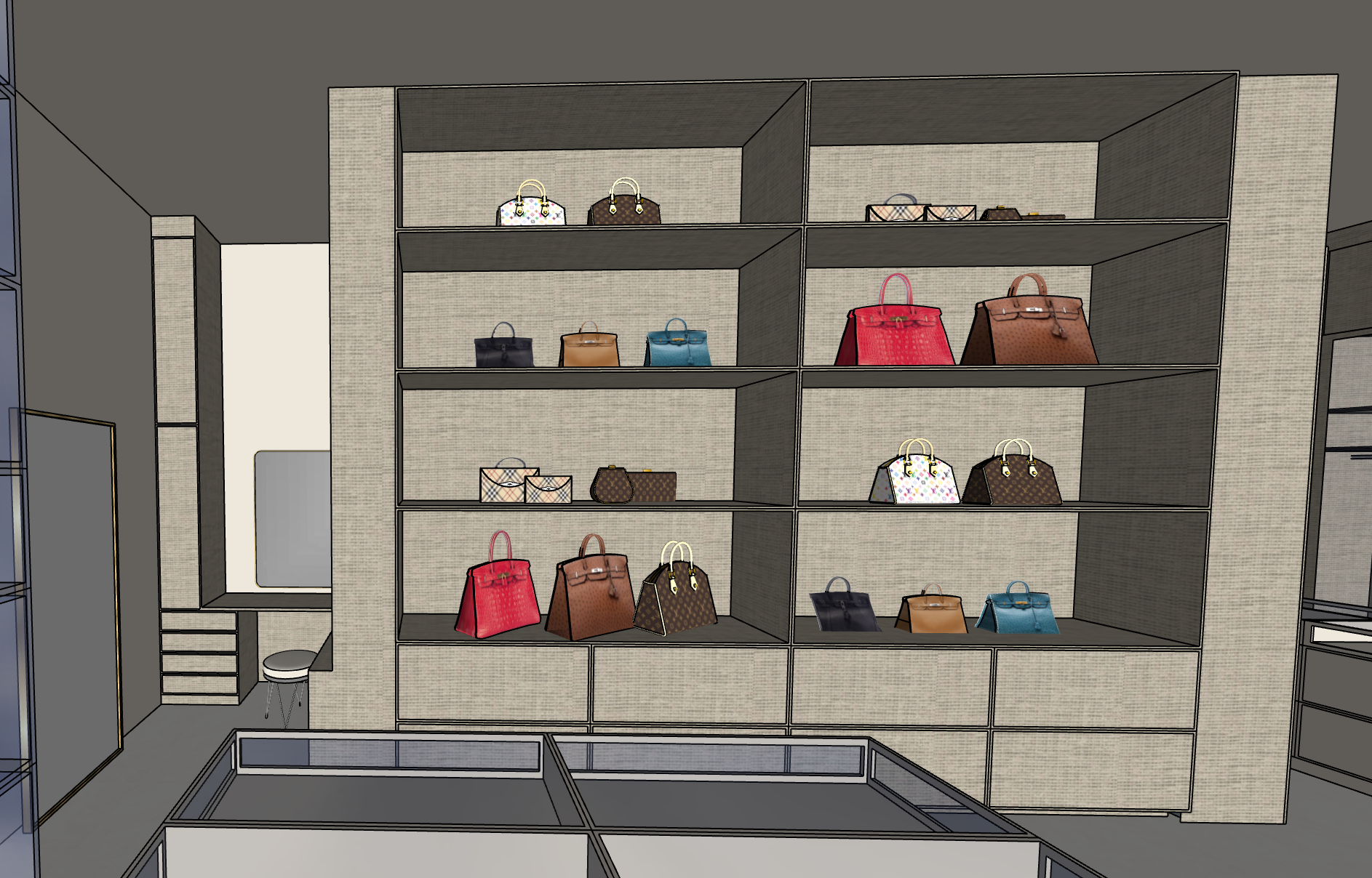 render a luxurious woman s walk in closet featuring sleek modern cabinetry with a light beige linen finish incorporate glass doors with subtle reflections creating a sense of openness use warm ambient lighting to evoke a cozy and inviting atmosphere the floor should be a smooth matte ivory tile add brass handles for a touch of sophistication the overall vibe should be elegant and serene with a focus on luxury and organization