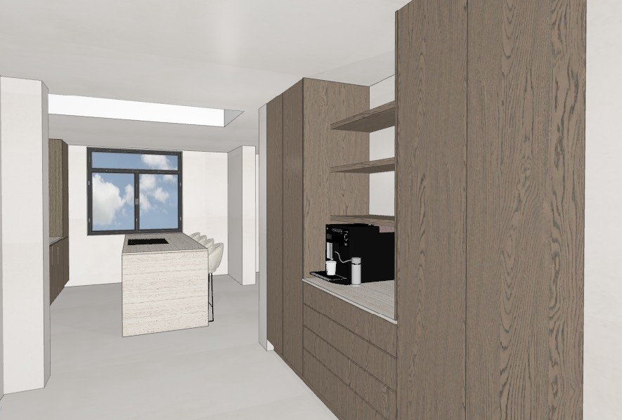 japandi style kitchen with beautiful veneered cabinets and a matt travertine worktop and island finish