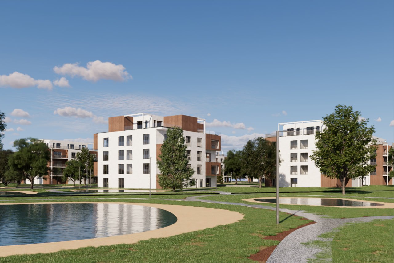 add realistic lighting with a bright sunny daytime atmosphere blue sky with a few clouds and realistic vegetation including green trees bushes and grass use natural textures for facades modern windows and detailed shadows include realistic materials like plaster concrete and wood