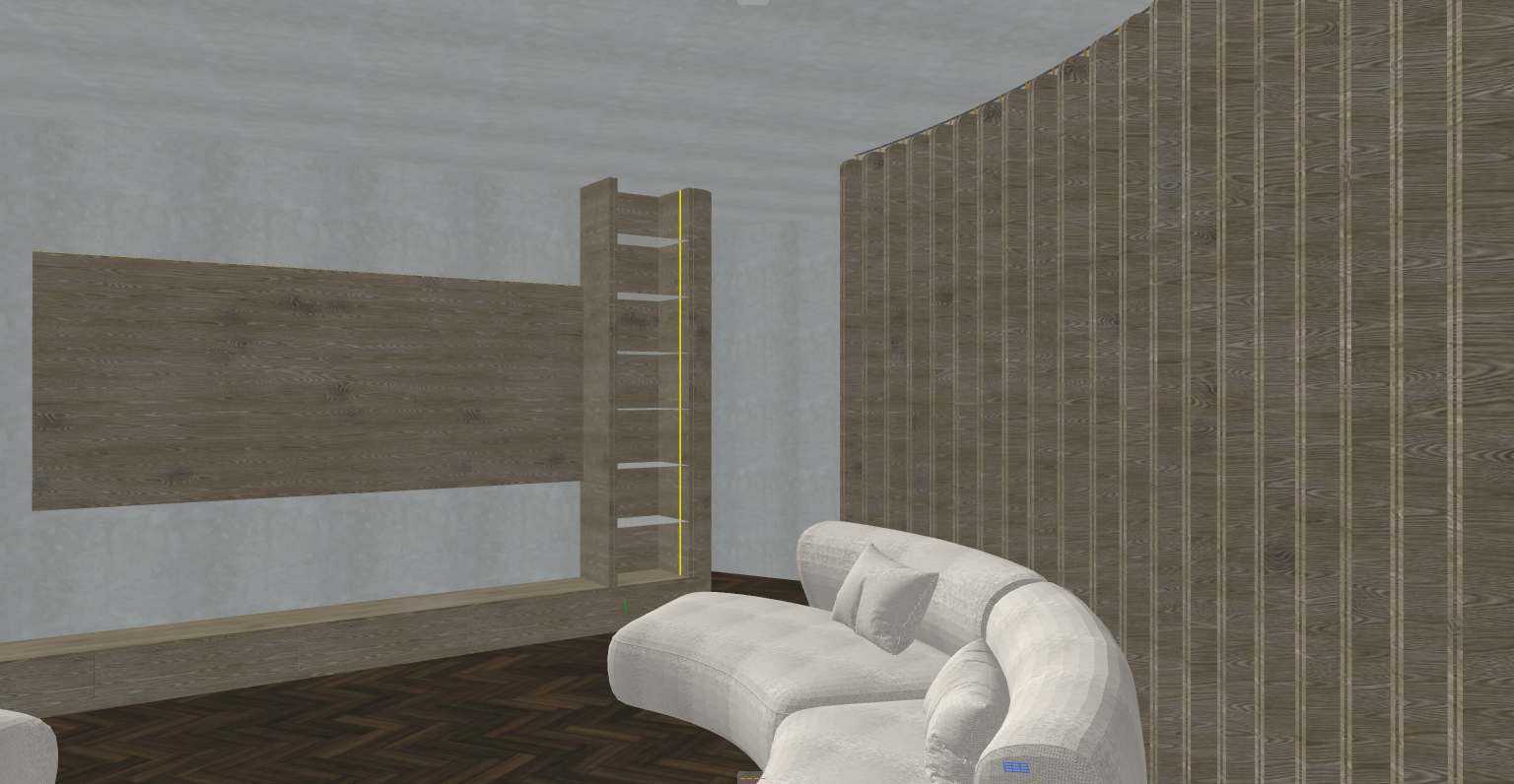 ultra realistic interior render enhancement of the provided scene keep the exact layout geometry proportions and all existing materials unchanged do not modify any architectural elements or furniture shapes add a modern flat screen tv centered on the existing tv wall panel left side perfectly aligned with the wooden horizontal feature tv should be slim black minimal bezel turned off or with a very subtle dark reflection no bright content enhance the built in shelving unit with premium modern accessories a curated mix of minimal decor such as matte ceramic vases a few stacked design books small sculptural objects and one or two dark glass or metallic decorative pieces keep it clean not cluttered refine materials to look high end and realistic maintain the existing wood but upgrade it to a rich warm walnut tone with subtle grain and matte satin finish improve fabric on sofa to look soft premium slightly textured boucl or fine woven keep vertical wood slats exactly as they are only enhance realism and depth lighting add soft warm led strip lighting inside the shelving already indicated enhance glow subtly introduce soft ambient lighting with natural shadows add a gentle ceiling light gradient for depth no visible fixtures required styling add a minimal coffee table accessory like a book small object if visible area allows keep everything modern clean and premium no clutter rendering ultra photorealistic high dynamic range lighting soft shadows global illumination slight depth of field for realism strict rule do not change layout camera angle furniture design or wall structure only enhance refine and add accessories tv