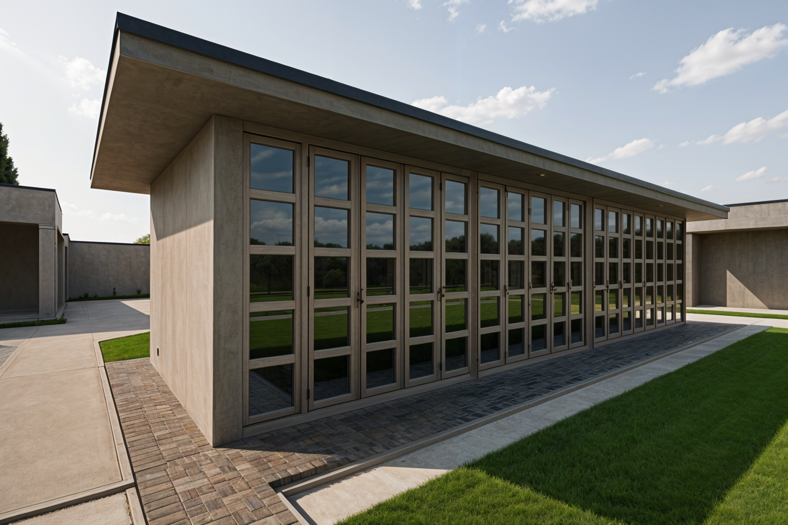modern sleek architecture office rooms seen through the windows surrounded by trees bushes grass architecture