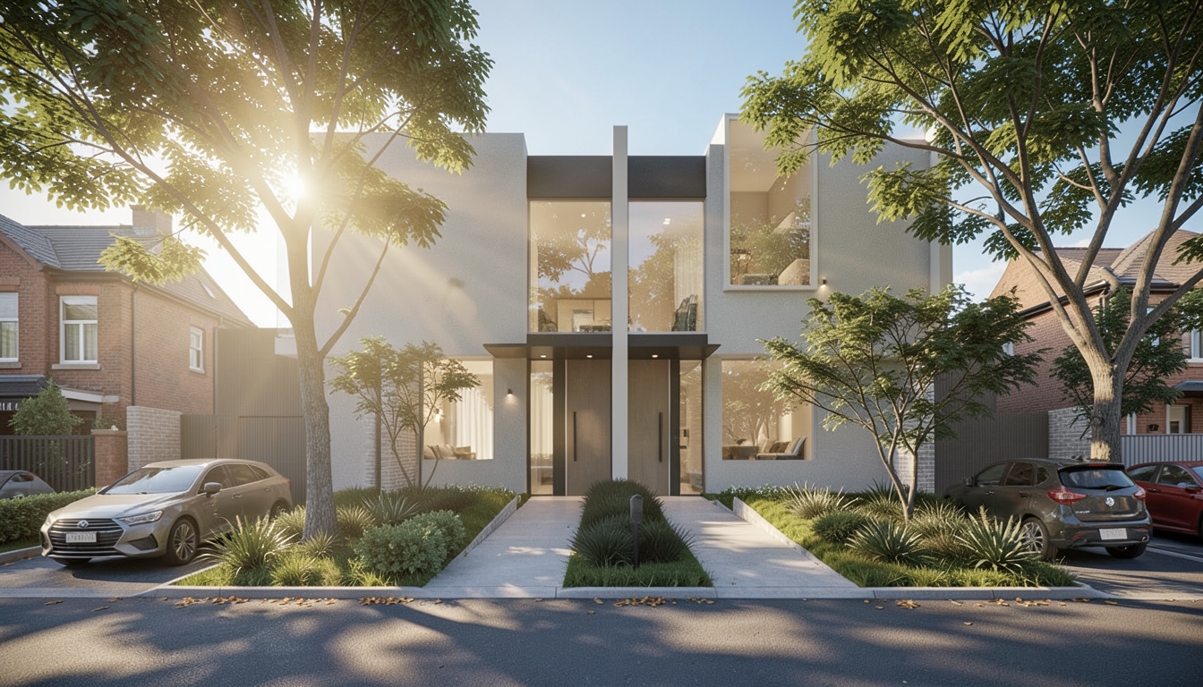 a melbourne townhouse with double volume behind the entrance luxuriate interior and lighting no outdoor furniture surround the property with a access vehicle access and lush with three trees the sun behind the trees so warm golden sunlight beams through the branches casting soft rays and subtle highlights realistic and detailed facade textures and a vibrant clear sky with light atmospheric depth render in hyper realistic architectural visualization quality 8k resolution