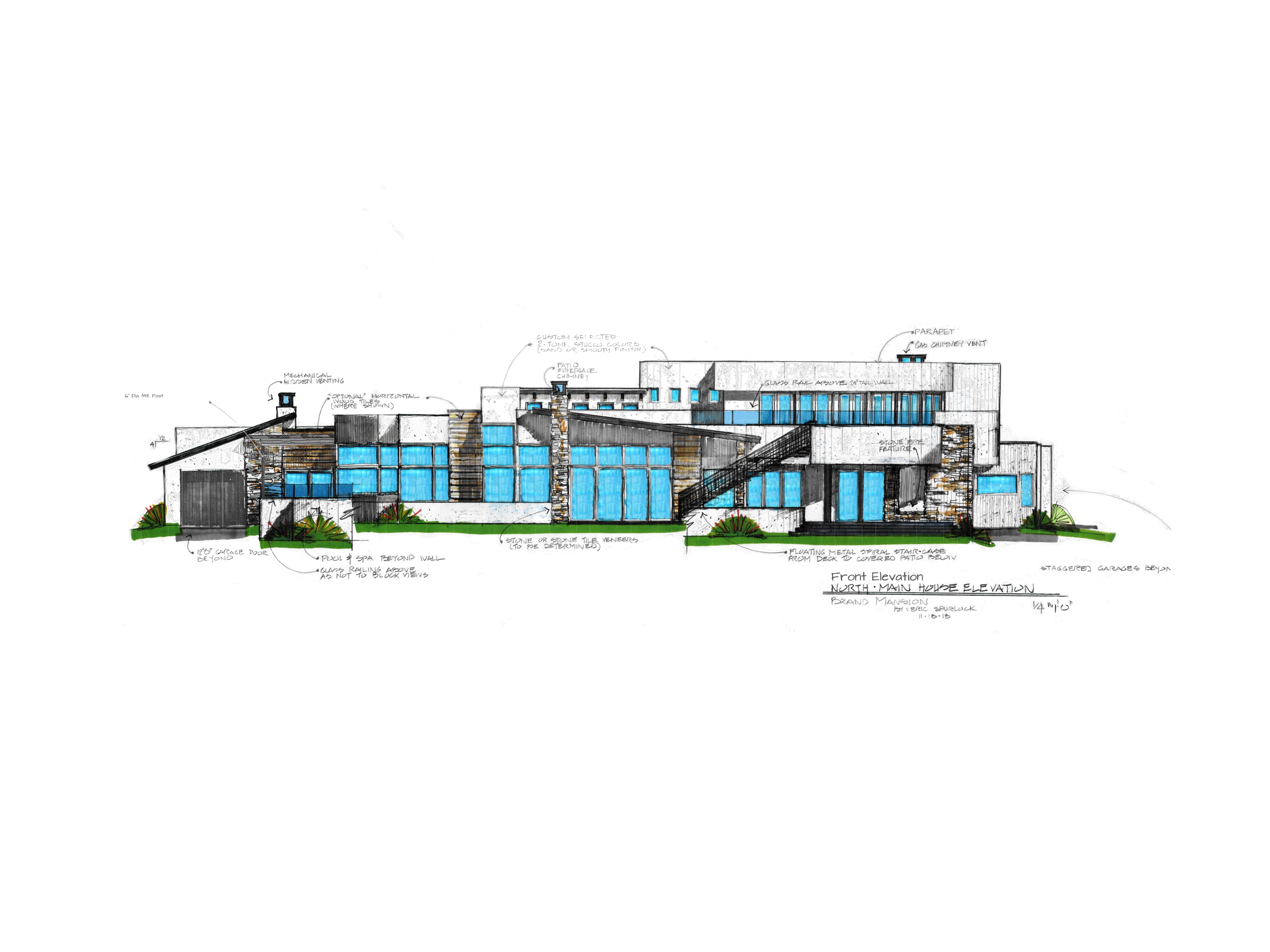 modern contemporary two story home put a rectangle modern pool and hot tub off to the left center side charcoal grey stucco and ledgestone siding