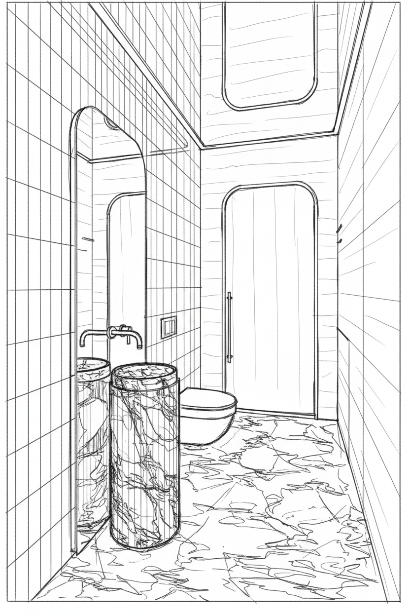 a calm elegant contemporary outdoor courtyard with a minimalist architectural language the scene features a tall central decorative screen made of vertical beige slats creating a refined semi transparent partition and adding rhythm depth and visual lightness to the composition the surrounding walls are smooth warm white plaster keeping the palette soft and understated lighting should be soft and natural like late afternoon daylight with gentle shadows and a calm luxurious mood the final render should look refined realistic and architectural with strong material clarity and a high end design feel dark grey aluminium glass light beige color at the walls remove the black rectangular back in the plants beige slats railing