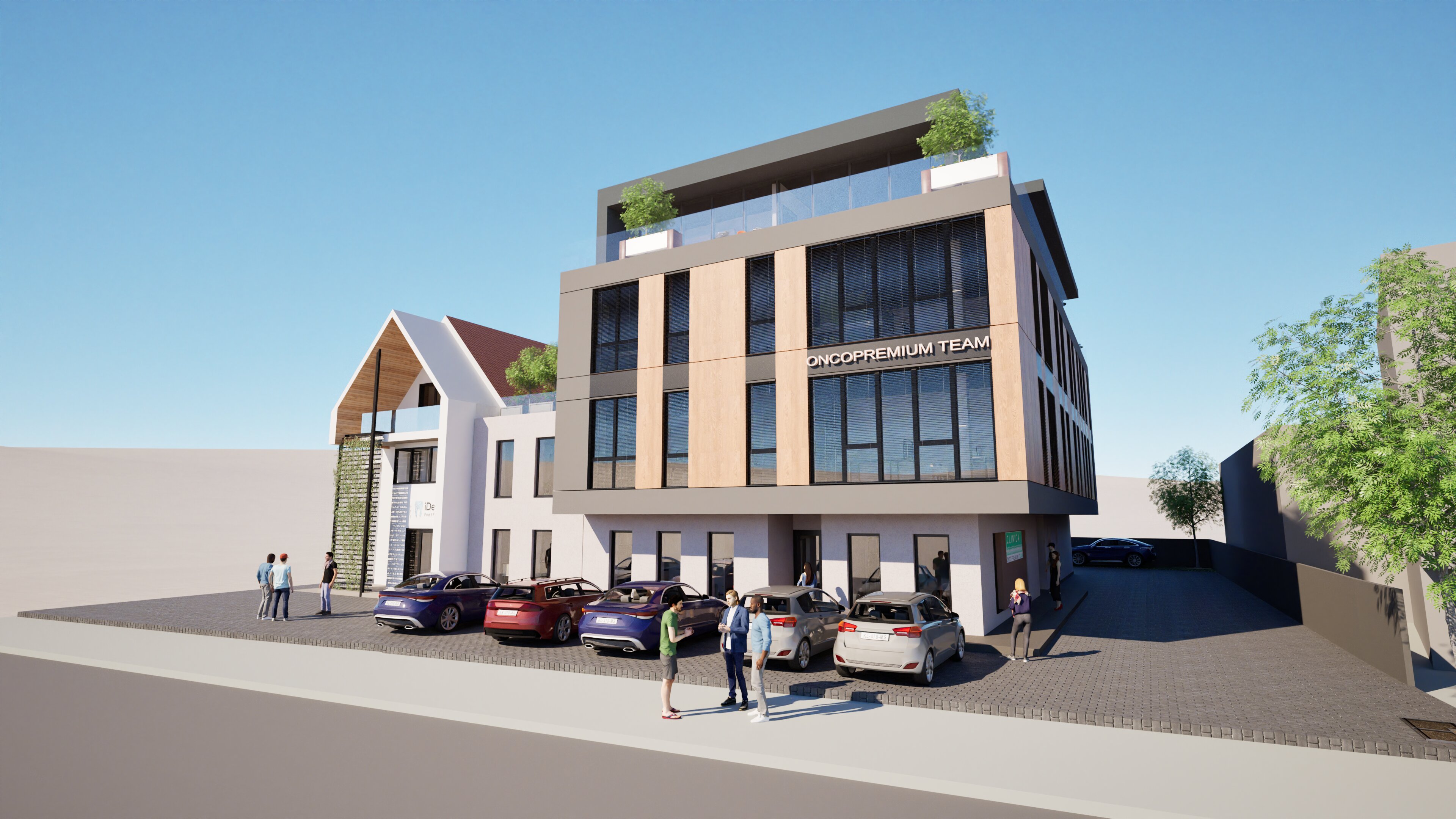 exterior shot overlay the two images considering that the tall building is inserted between the two smaller side ones modify the vanishing angle if necessary