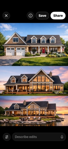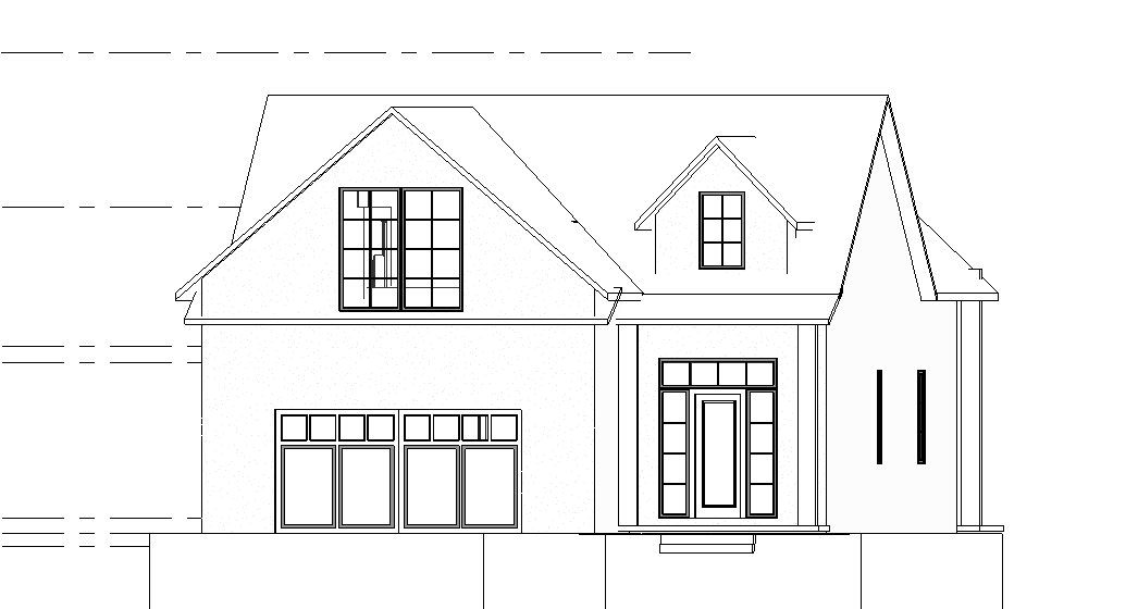 exterior shot preserve the exact massing proportions and window placement of the uploaded elevation render this home in the style of an informal new england coastal cottage exterior materials include natural cedar shake siding white painted trim black divided light windows and a natural stone foundation base roof is a cross gabled composition with three front gable dormers and architectural asphalt shingles in weathered grey add a welcoming covered front porch with simple square columns and white railings landscape with soft lawn hydrangeas boxwood shrubs and relaxed coastal plantings lighting is warm late afternoon golden hour photorealistic architectural rendering soft shadows realistic materials