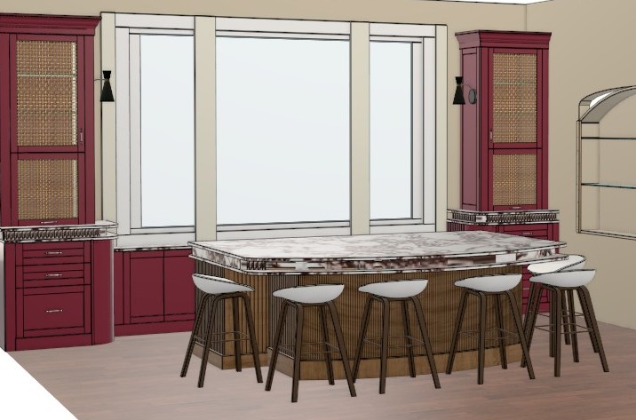 the island is reeded rift white oak the countertop is reeded matching stone sandwiched in between two standard stone tops the back of the seating area is curved the cabinets are high gloss red paint the right wall and recess have have a green and beige wallpaper the bar has a brass foot rail the window looks out to a bay