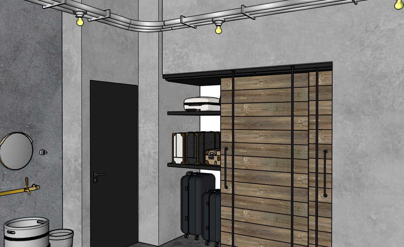 photorealistic render of a minimalist locker room with industrial pendant lights concrete and wood flooring matte black lockers and neutral walls keep the exact layout and materials add subtle ambient occlusion warm contrast and slight surface imperfections for realism no natural light please don t change the materials or layout or furnture or the design of the lights