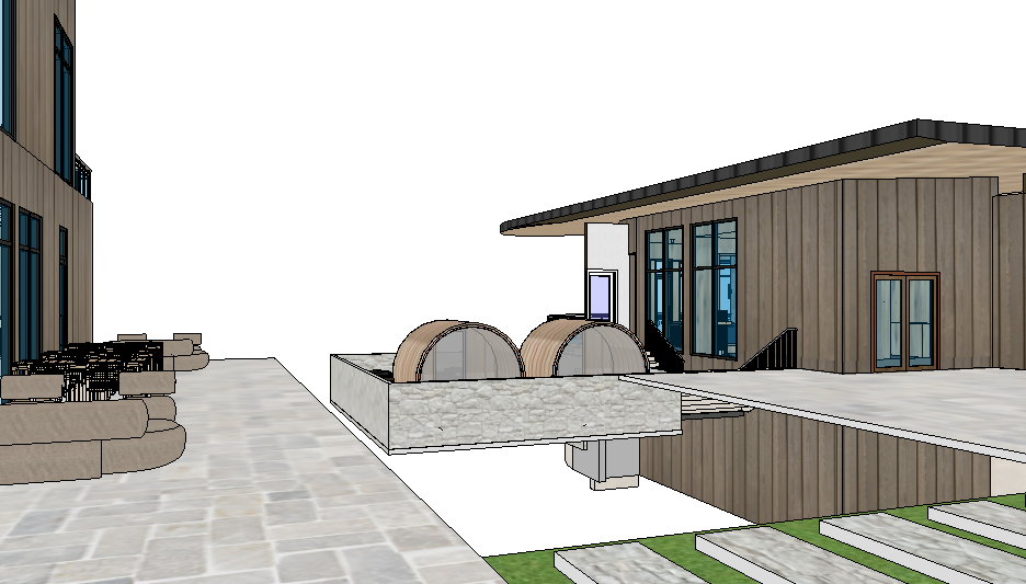contemporary california garden path oversized concrete pavers in linear layout gravel infill joints flanked by low lavender and dusty miller planting olive trees spaced rhythmically along house facade white exterior wall with large glass doors minimalist landscaping drought tolerant garden neutral tones warm afternoon light architectural digest style ultra realistic