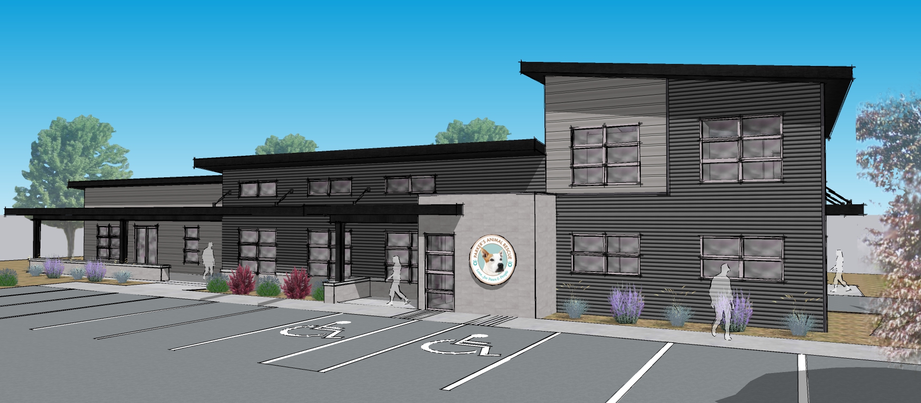 contemporary metal commercial building with combination of two different metal sidings and concrete masonry unit finishes landscaping people and dogs create activity across the building facade background is a steep hill approximately 100 yards behind the building covered in scrub oak paved parking lot is asphalt with concrete sidewalks weather is sunny with reflections in the windows