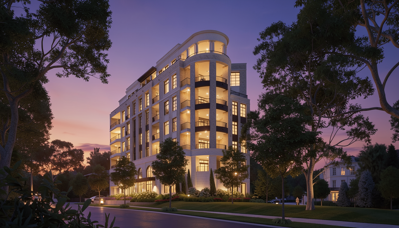 nice evening rendering for marketing a condo project gradient dusk sky building lighting