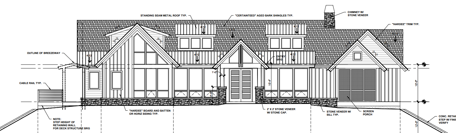 north carolina modern mountain home white siding natural stone screen porches as shown dense pines and hardwoods blue sky and clouds foreground landscaping