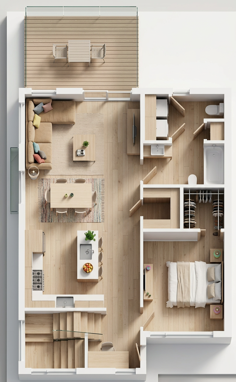 the red color is moru glass and add indrect light follor the blue line there and make slatted to the island cabinet