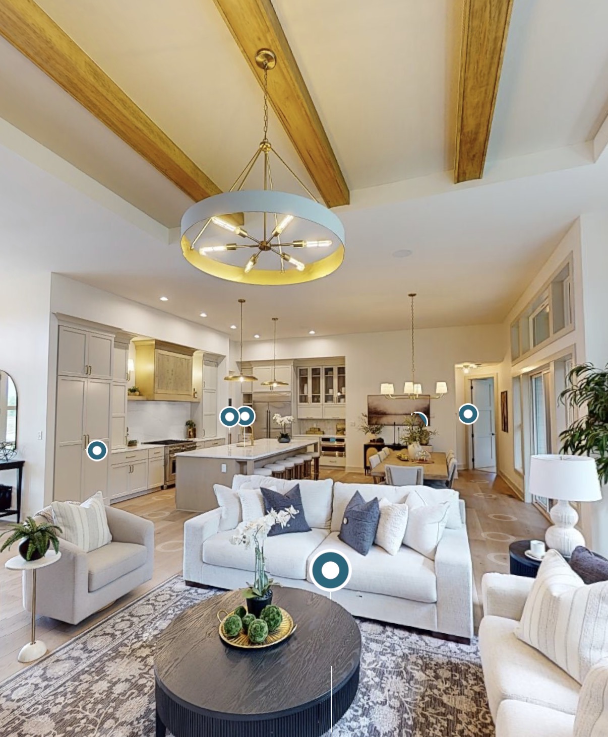 make all cabinets black remove make the island with a waterfall countertop remove the wood ceiling beams make the windows black vinyl