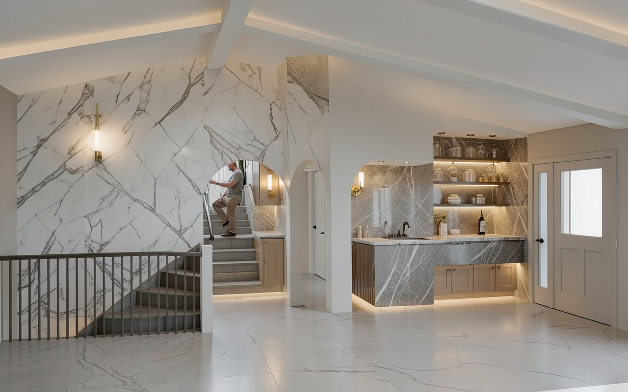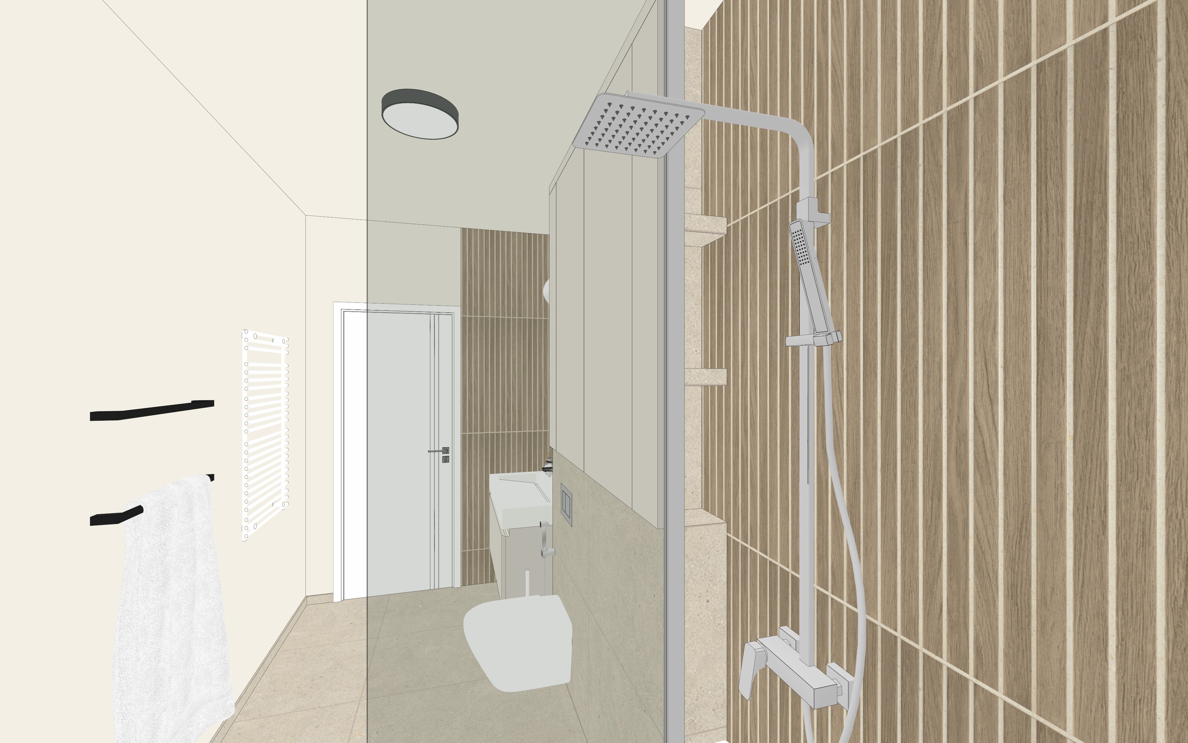 act as a world class architectural visualizer and 3ds max corona renderer master i am providing an image of a 3d bathroom scene taken from a frontal perspective i need you to generate an ultra photorealistic architectural render based exactly on this geometry and layout do not change anything in the scene preserve exact layout proportions camera angle materials object placement and composition materials strict preservation ceramic tiles cream on walls and floor natural beige stone look subtle texture variation exactly as in 3d the second darker ceramic on wall the one more must have slightly wood graines keep all grout lines visible correct spacing and exact colour as in image of reference on the darker ceramics must be white and the grout from cream ceramic must be slightly darker than ceramic cream vanity and cabinet soft matte finish realistic imperfections entrance door in white matte paint flat finish no gloss preserving exact vertical line detailing panel pattern as in the original 3d model the left wall front must be preserved exactly as in the original image light greige color warm beige grey matte paint finish no texture change no added elements ceiling must be light greige same tone family as right wall smooth matte finish uniform color sink faucet element must be chrome shower system must be chrome toilet flush plate must be chrome accessories physically accurate reflections slightly imperfect the wall lamp above sink must have chrome accesories toilet brush accesories must be white exactly as in 3d shower screen must be clear transparent glass not frosted with realistic reflections refraction and subtle edge highlights the radiator must be white matt entrance door in white matte paint flat finish no gloss preserving exact vertical line detailing panel pattern as in the original 3d model the lamp of the ceiling is dark grey matt lighting very important neutral ceiling light 4000k diffused and even physically accurate global illumination corona style realistic light bounce soft contact shadows natural falloff realism details subtle roughness variation on ceramics micro imperfections on wood ceramic grain slight unevenness chrome with realistic reflections not perfect mirror slightly used look mirror reflections must be physically correct include environment reflection no flat shading transparent glass must show realistic thickness reflections and refractions soft ambient occlusion in corners under vanity and near floor accurate contact shadows and edge definition camera render settings eye level perspective same framing as reference realistic exposure balanced whites no overexposed highlights cinematic dynamic range sharp but natural no over sharpening style ultra photorealistic high end architectural visualization corona renderer look clean minimal natural tones no added objects no styling changes no redesign