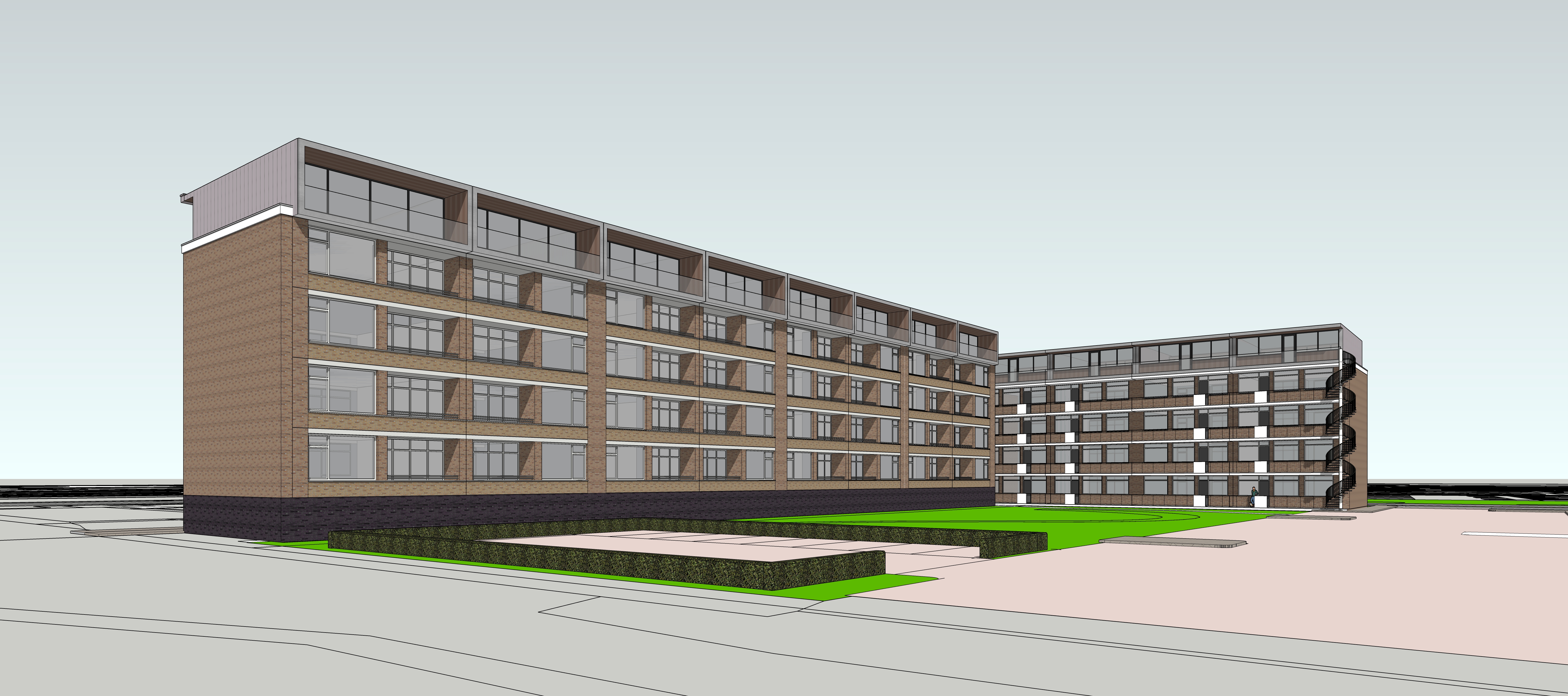 make this a photorealistic scene add some people trees and bushes the weather is sunny with a few clouds the grey parts in facade are zinc with vertical lines there are parking places on ground level the baluster on top level is made of glass keep original viewpoint no glass baluster on rooftop