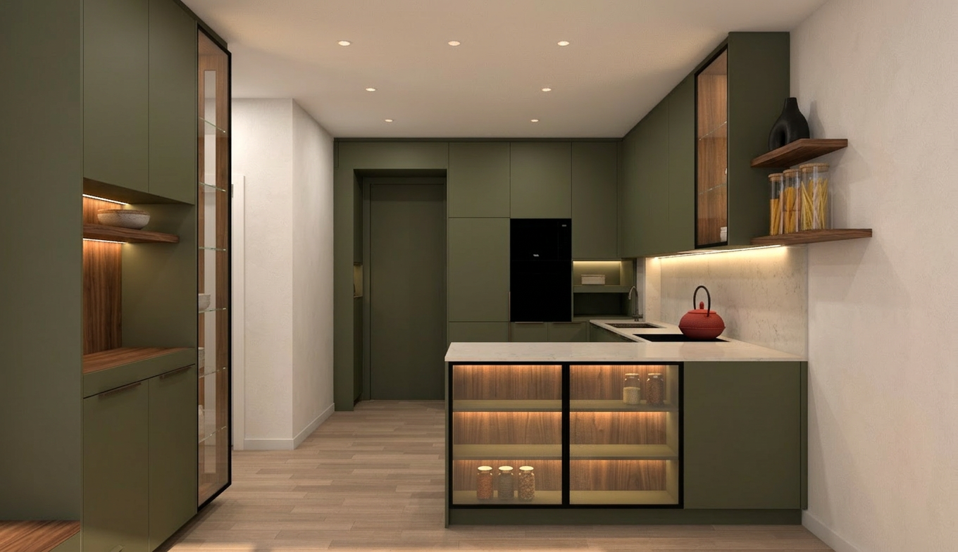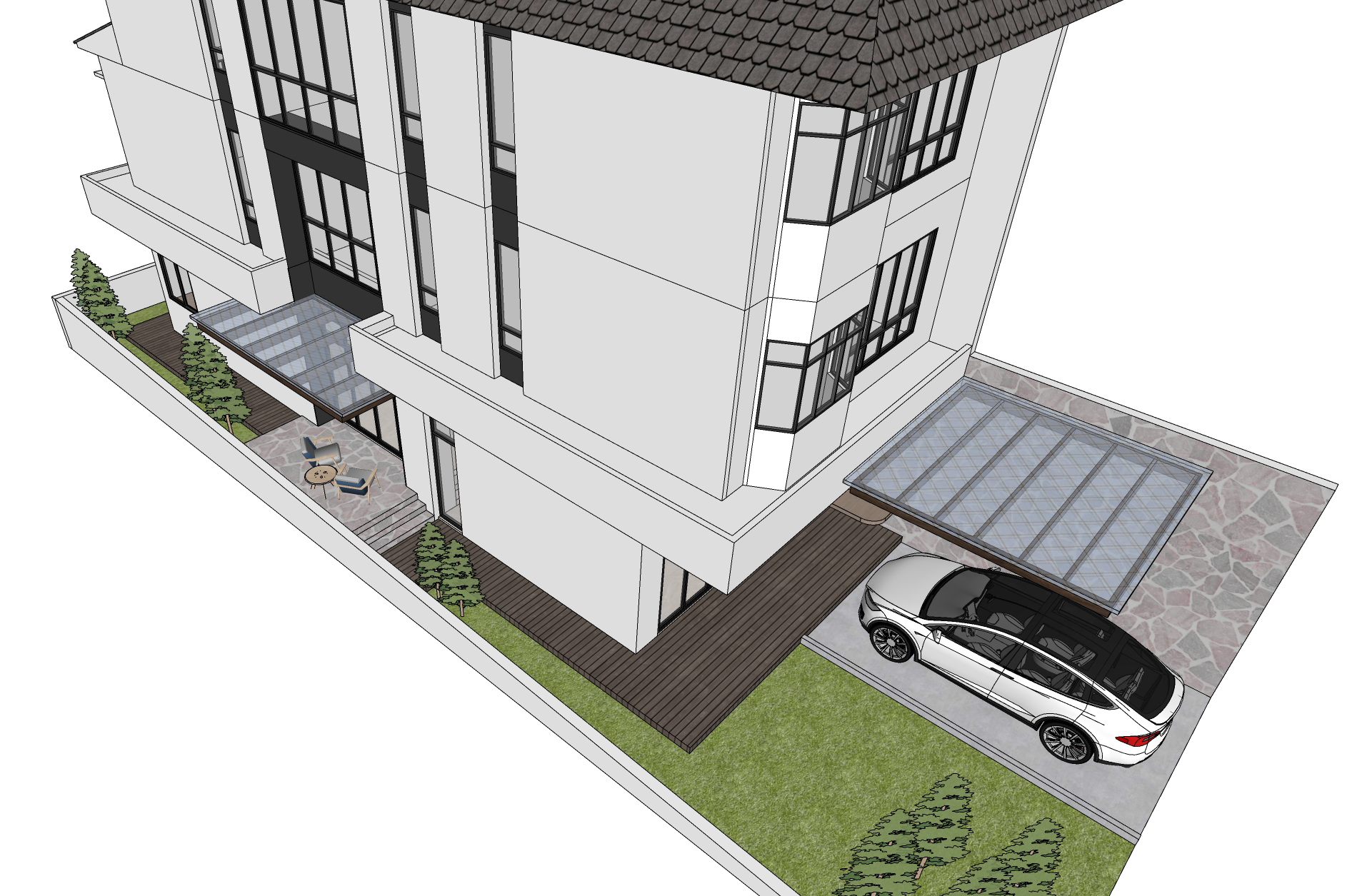 the original image is the authoritative reference follow the drawing exactly preserve all wall positions and room proportions exactly no redesign no change of camera angle no layout modification no change on all geometry add background of greenery and other lower houses and add soft morning sky