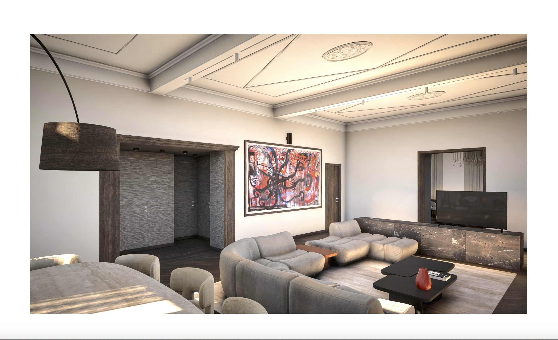 hi i am an interior designer starting from an initial render i want to try changing the sofa and the tv console in the living room the sofa must have the same composition but a different model which i am attaching meanwhile the tv console cannot be full height it is freestanding and has a low rectangular body with a top surface that holds the tv for which i am attaching a reference image