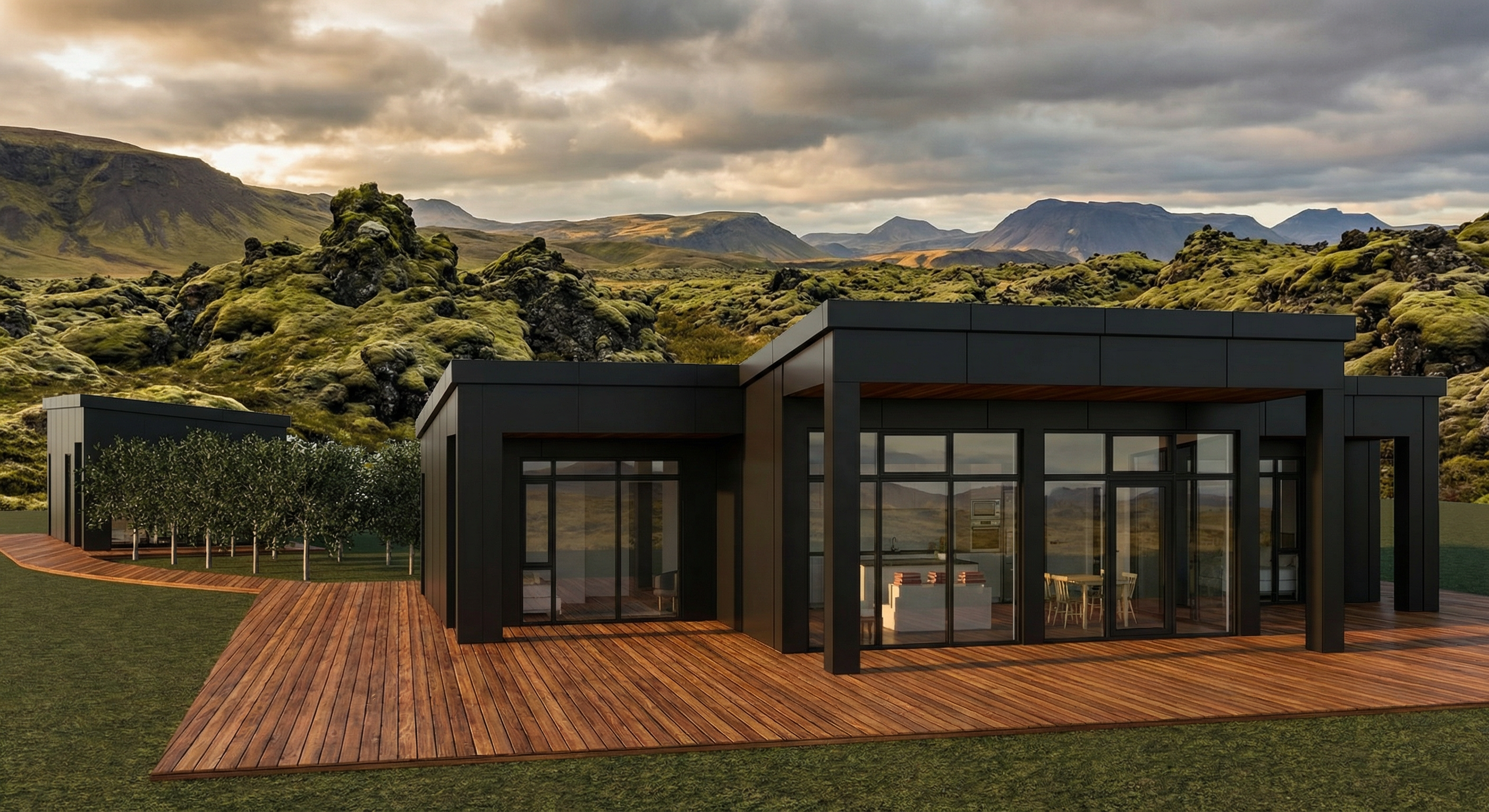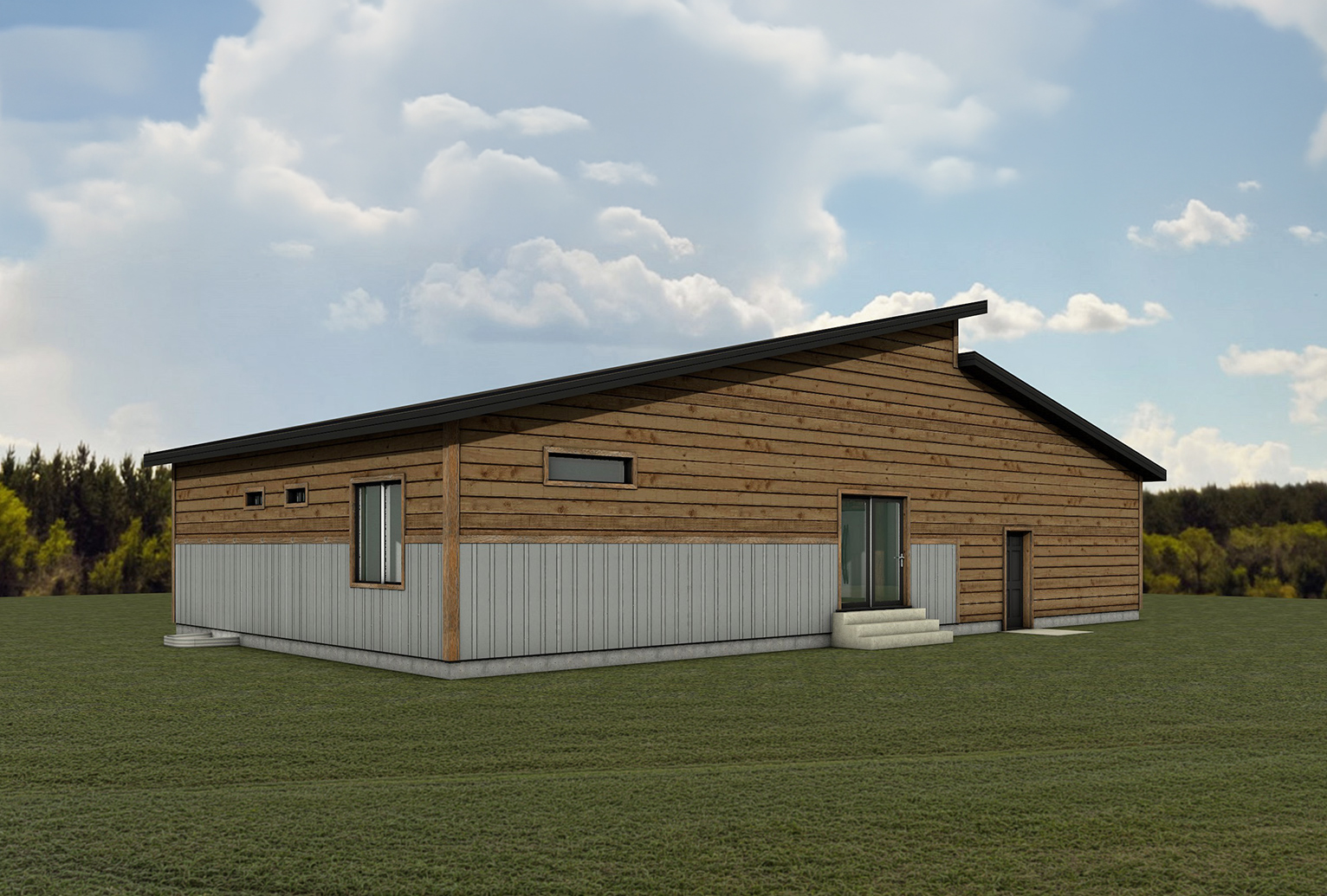 a modern house retain the exact structure colors and window arrangement rooflines siding foundation height porches wood stain colors and proportions exactly as shown in the reference image all roofs are black metal as shown integrate structure into the terrain there is a lush dense forest of mixed hardwoods that s further back behind the structure add cooler afternoon sunlight subtle dappled highlights across the siding and grass create ultra realistic lighting crisp shadows detailed textures in the siding and glass reflections and an overcast sky show only a few lights visible inside render in hyper realistic architectural photo visualization quality 8k resolution add a gravel driveway tying into the concrete sidewalk make it the summer season keep cobble sidewalk out front