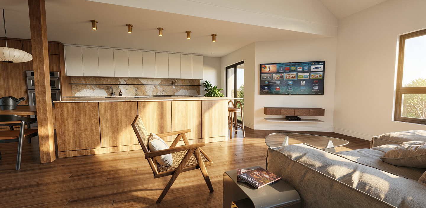 convert this floor plan into a realistic isometric 3d view of a full house show the space from an elevated angle with furniture walls and details visible modern wood flooring in all white and beige furniture no plants bbq outside use the same furniture as shows on the plan do not change the orientation of the floorplan
