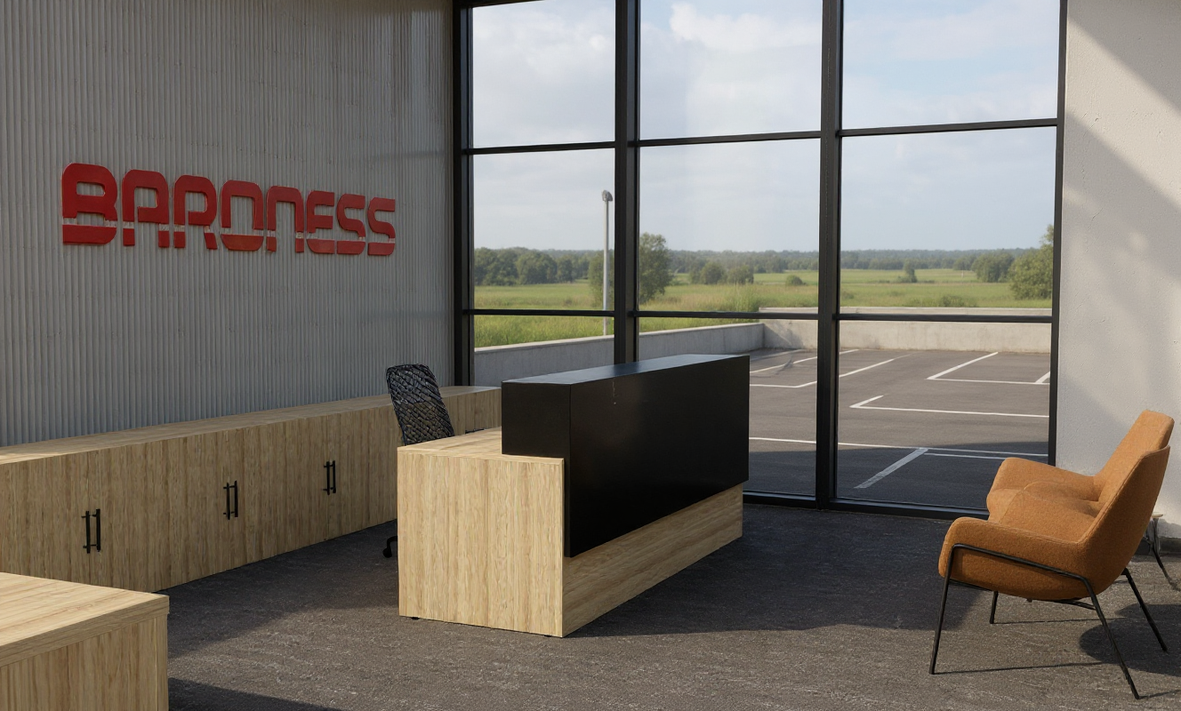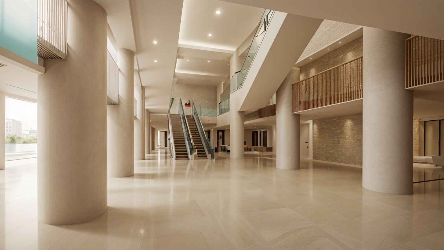 render image keeping all structure and finishes the same but make photo realistic make ceiling an office 2x4 grid with lights make outside bakcground an open field