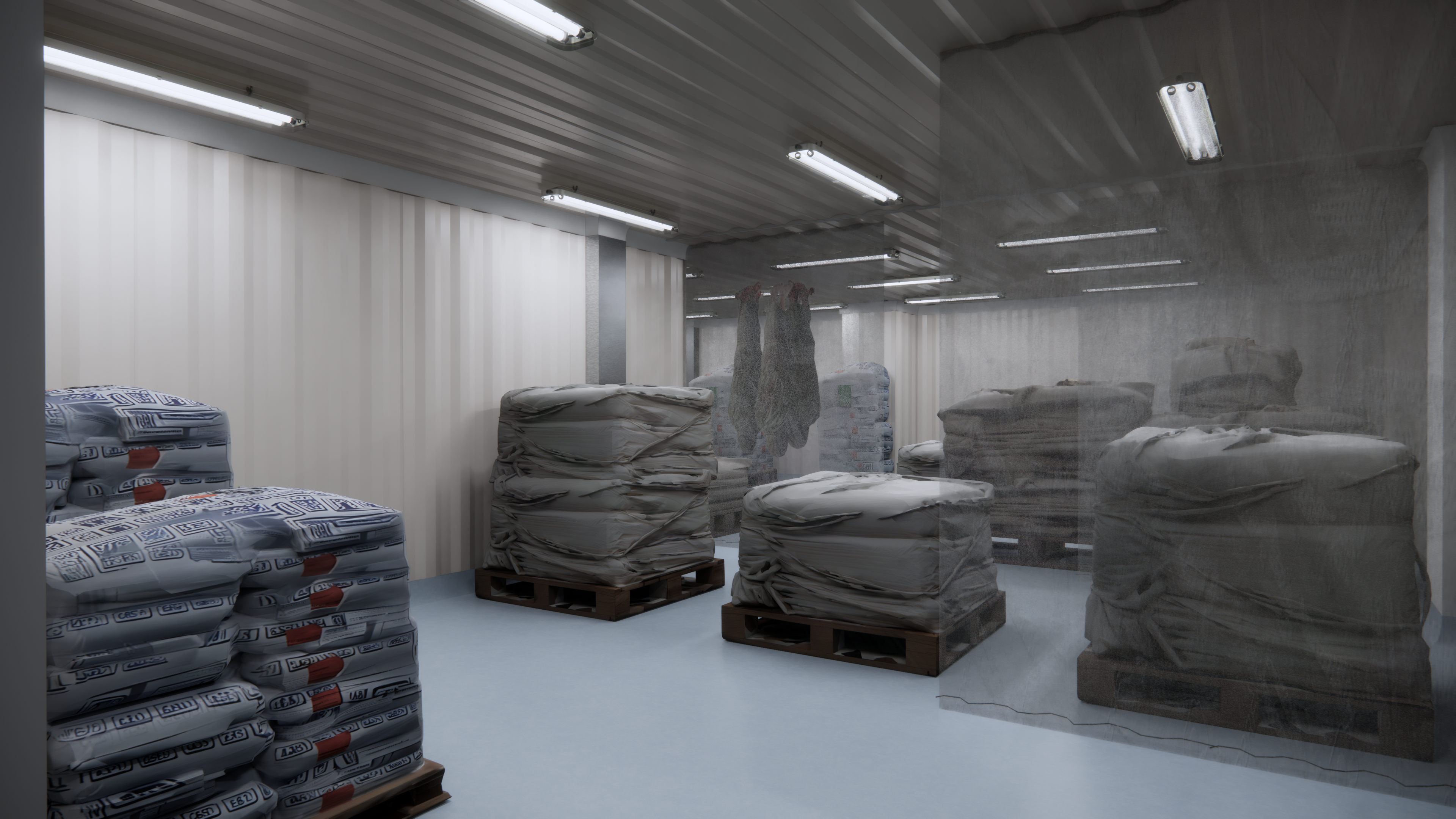 a warehouse interior filled with neatly stacked bags on wooden pallets the walls are a soft light gray with a slight metallic shimmer the ceiling is a bright reflective silver with long sleek fluorescent lights casting a cool white glow transparent dark mesh curtains hang partially around the pallets providing a contrast with their slightly matte texture the floor is a clean smooth light blue adding a fresh modern feel the atmosphere is serene and orderly with a focus on cleanliness and organization emphasizing efficiency and minimalism