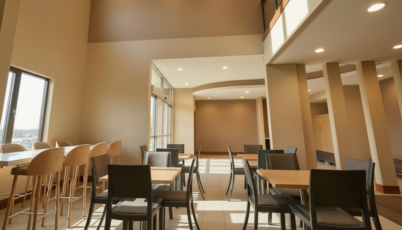 exterior shot use reference image materials and lighting add the same lattice and logos on the wall on the back of the image dont modify anything else on the original layout