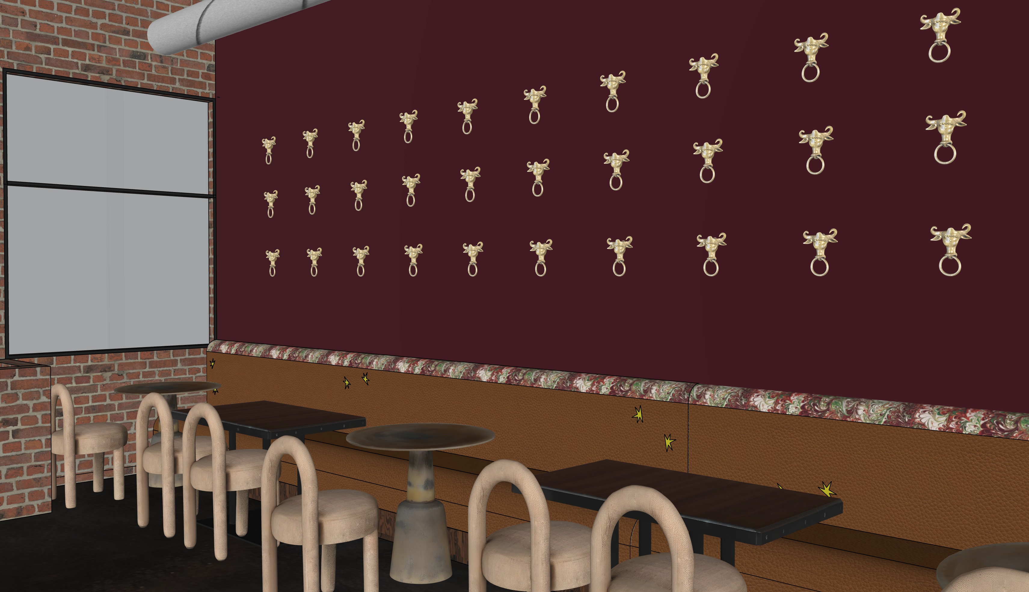 professional architectural photography of an upscale spanish tapas restaurant banquette seating area eye level perspective angled view along continuous banquette warm intimate hospitality atmosphere custom upholstered banquette in rich camel brown leather with realistic natural grain subtle creases stitching detail and slight tonal variation between panels softly worn leather texture with authentic reflectivity decorative upholstered top rail in marbled fabric with intricate pattern realistic woven textile texture and depth deep burgundy painted plaster wall with subtle hand applied finish variation matte sheen and realistic wall texture mounted polished brass bull head ring hardware evenly spaced across wall highly reflective brass material with realistic highlights subtle patina and natural imperfections dark stained wood tables with visible wood grain slight wear at edges and soft satin finish sculptural pedestal and caf tables with realistic metal patina oxidation and material variation fully upholstered dining chairs in cream boucle fabric with highly detailed woven texture soft fibers subtle shadowing and realistic compression at seat cushion exposed brick wall with authentic mortar joints material variation and realistic depth dark flooring with subtle reflectivity and natural wear patterns warm ambient restaurant lighting soft directional lighting from above realistic shadow falloff indirect bounce light from surrounding materials natural light entering from window with realistic exposure balance shot on full frame camera 50mm lens shallow depth of field professional interior photography hdr ray tracing global illumination ambient occlusion physically accurate materials ultra photorealistic architectural digest style dezeen style luxury hospitality photography extremely realistic materials micro imperfections subtle wear natural variation 8k resolution floor is a dark crarcoalstained concrete the chairs are a tan textured fabric there is a soft amber sunset glow illuminating the room evenly light from the ceiling brightens the vibe the paint is a more berry purple red the ceiling hs black in tiles