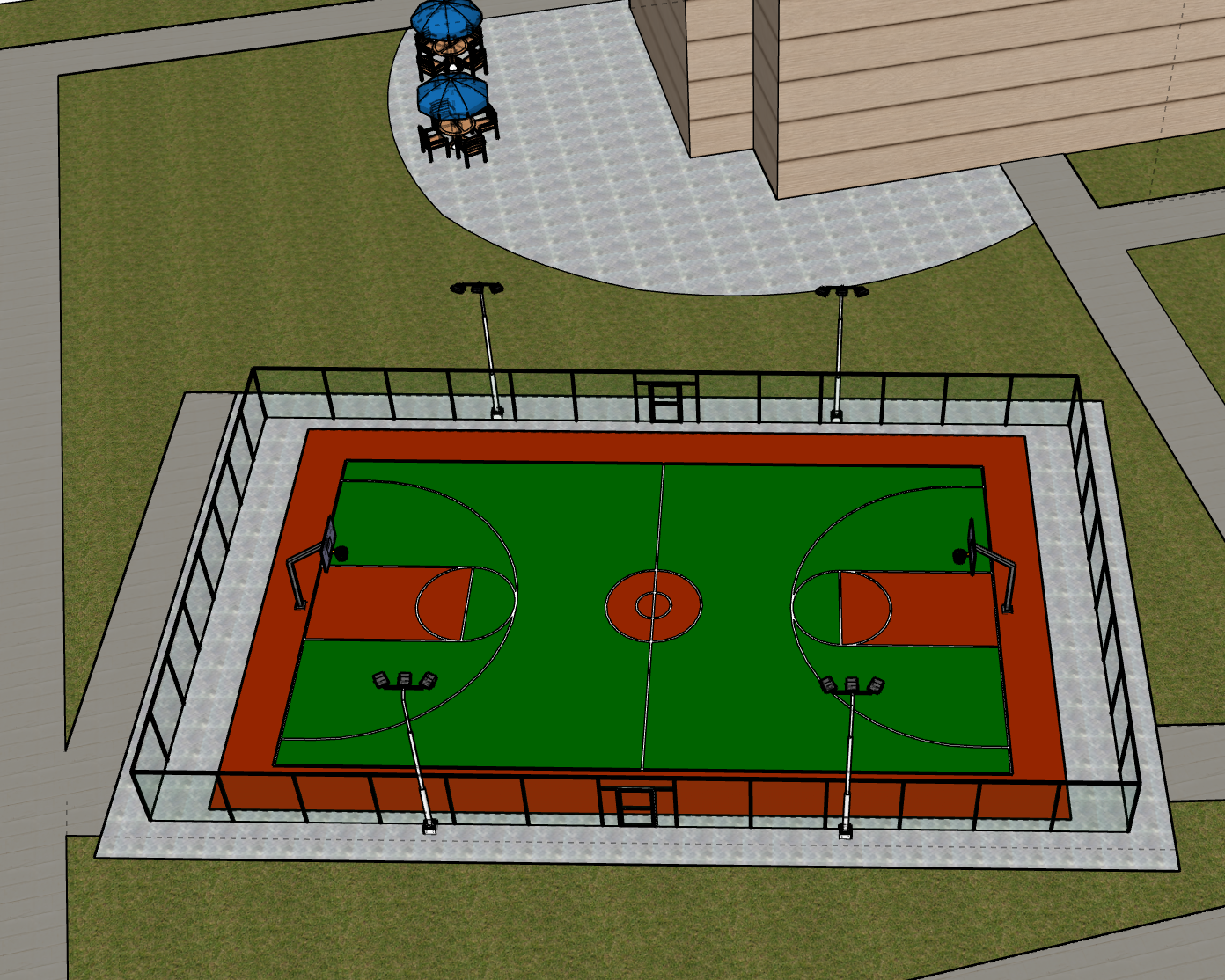 render this scene into a photo realistic version don t change my design though and make the clubhouse look cooler